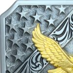 This belt buckle is a seamless blend of majesty and sophistication. The golden eagle, captured in mid-flight, is a potent symbol of freedom and foresight, set against a backdrop that evokes the flag, rendered in shades of silver. This striking contrast between the gold of the eagle and the silver background creates an eye-catching piece that epitomizes elegance and bravery.