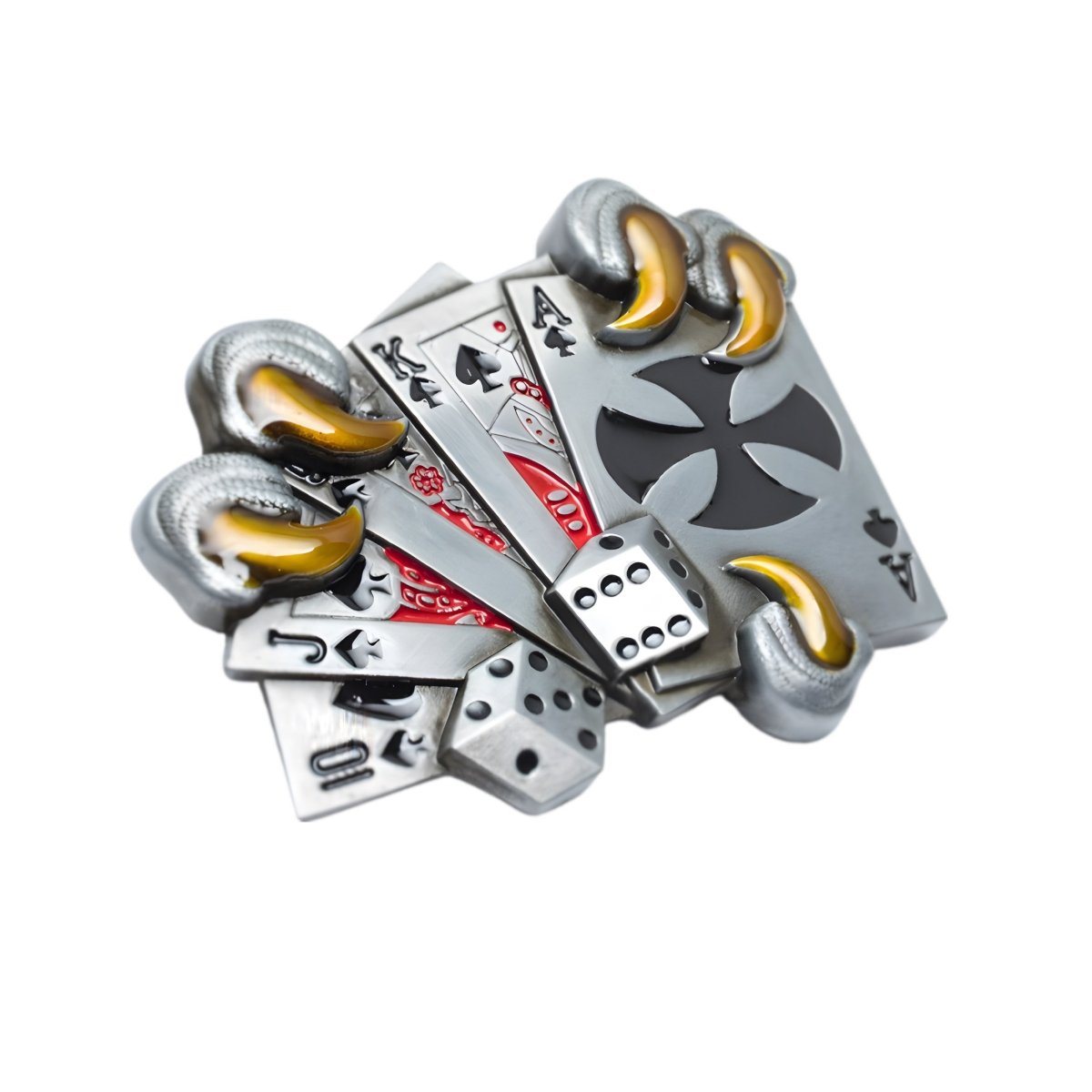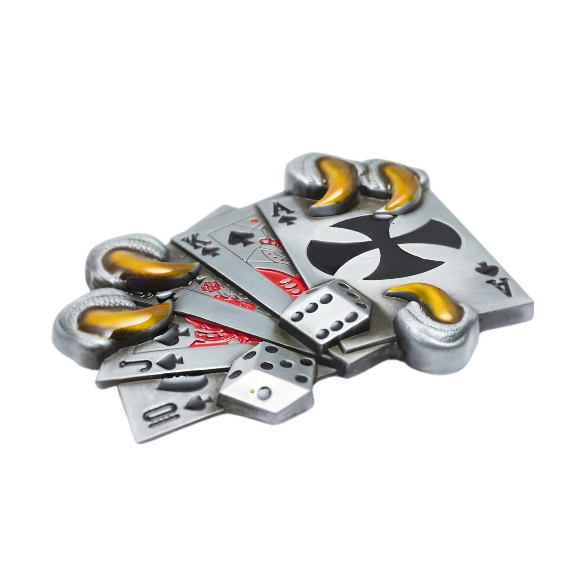 This belt buckle represents a bold mix of luck and strategy, with playing cards and dice carefully held by eagle talons, symbolising a tactical and adventurous spirit in the game of life.