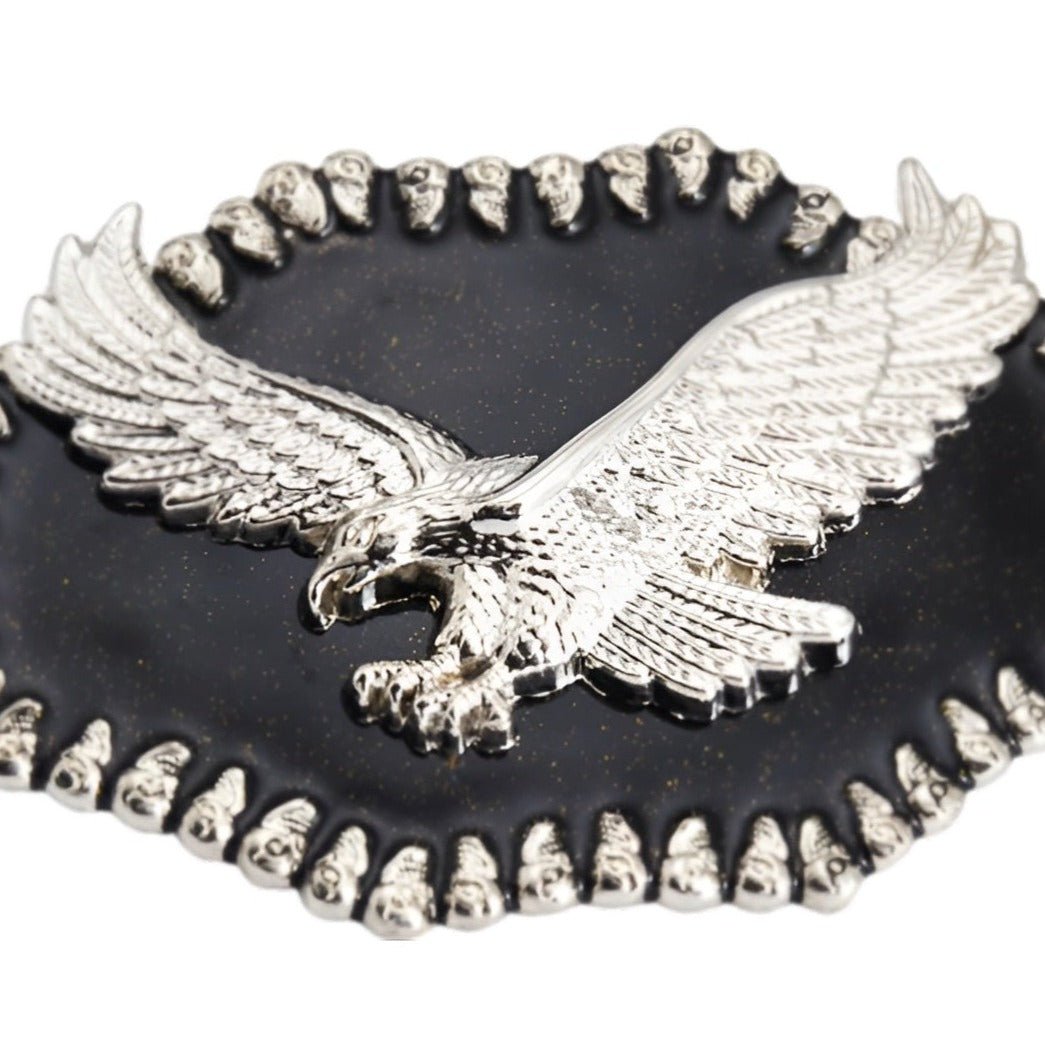 Discover the accessory that will transform your look—a belt buckle where boldness meets timeless elegance. This emblem of personal expression, featuring the majestic eagle in flight, is more than a mere clasp; it's a style statement. Designed for those who dare to stand out, this piece captures the essence of a bold and confident fashion. The black background, sprinkled with a dust of sparkles, serves as the backdrop for the bird of prey, whose outstretched wings symbolize freedom and power. Every detail has been meticulously crafted to endow its wearer with a distinguished appearance and magnetic charisma.