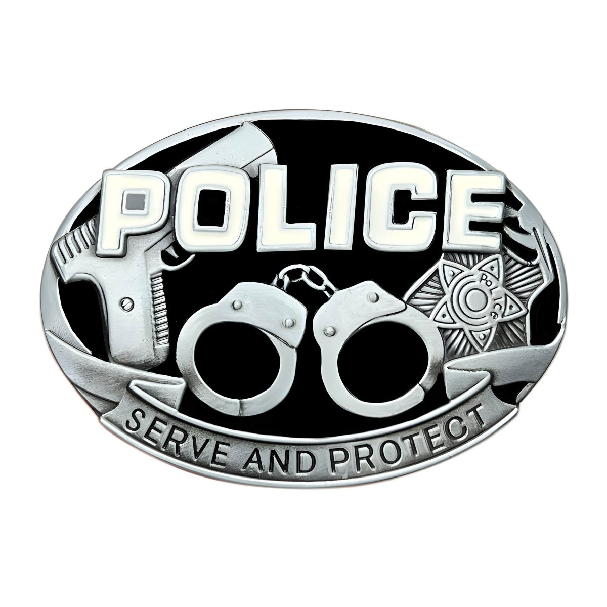 This belt buckle pays a profound tribute to the police force, proudly displaying the iconic tools of the trade. "POLICE", engraved in uppercase letters, powerfully underscores the authority and responsibility, while the motto "SERVE AND PROTECT" highlights the solemn commitment of each officer. Handcuffs and a badge complete the design, symbolizing the daily dedication to safety and justice.