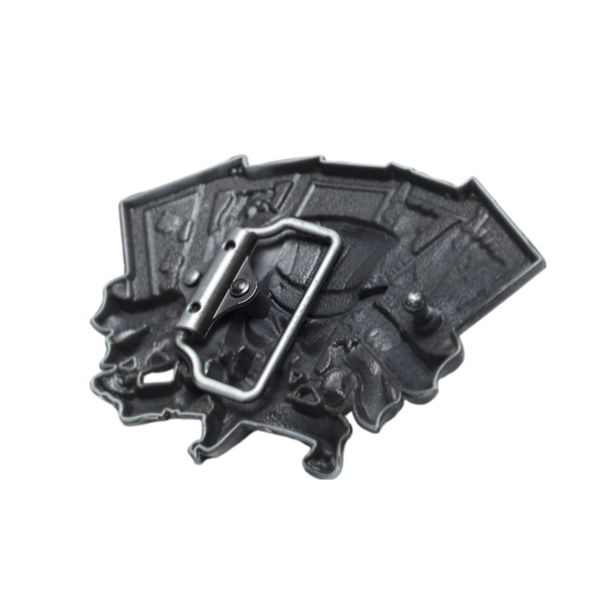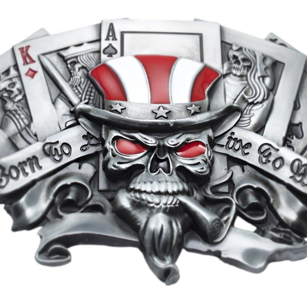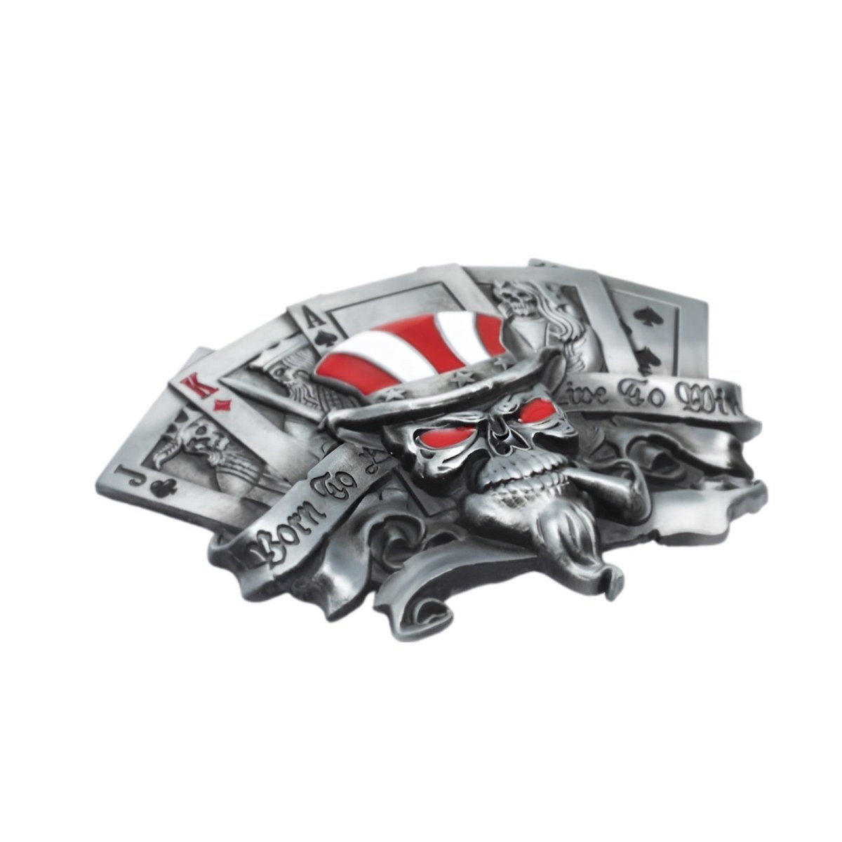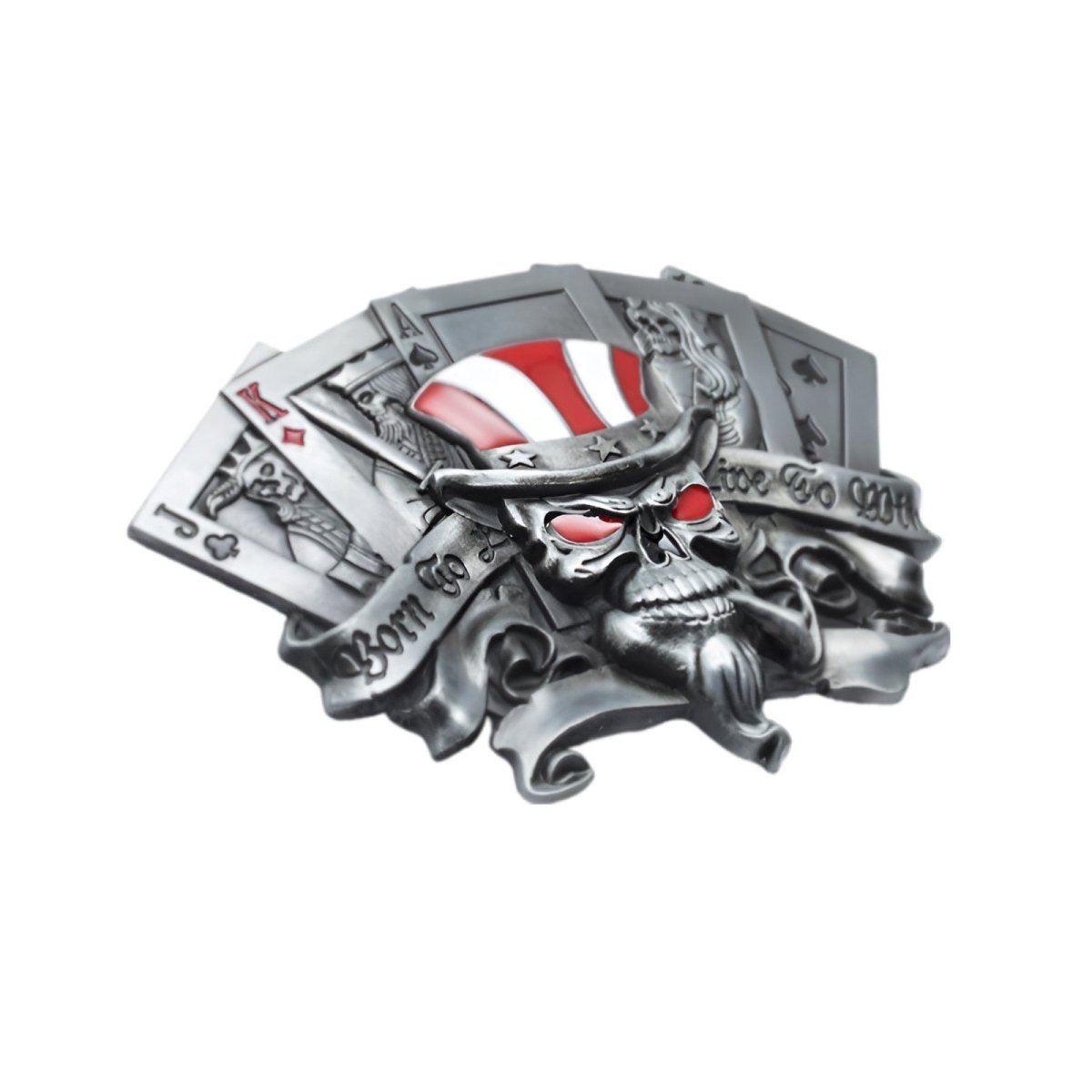 Immerse yourself in a world of gaming and daring with this belt buckle that embodies a conquering spirit. Framed by iconic cards, the central skull is a tribute to strategy and determination. This piece is more than just an accessory; it's a true talisman for those who boldly and intelligently take control of their fate. The engraved symbols evoke the thrill of victory, an honour bestowed only upon the bravest.