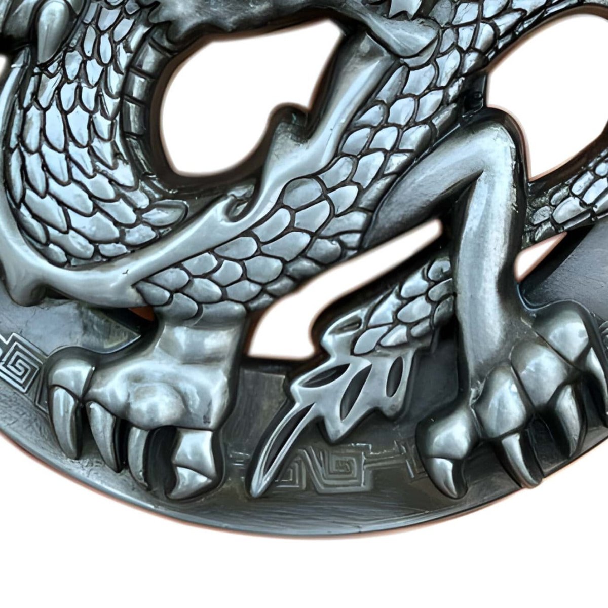 This piece does more than just adorn an outfit; it tells a story rich with culture and tradition. The dragon, majestically encircled by a classic Greek border motif, represents a bridge between the ancient and modern worlds. This belt buckle not only offers its wearer a distinctive style element, but also a sense of connection to the timeless legends of Asia, making this accessory a statement of enduring wisdom and power.