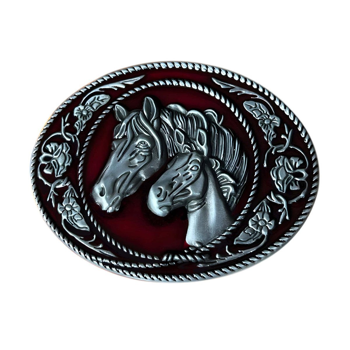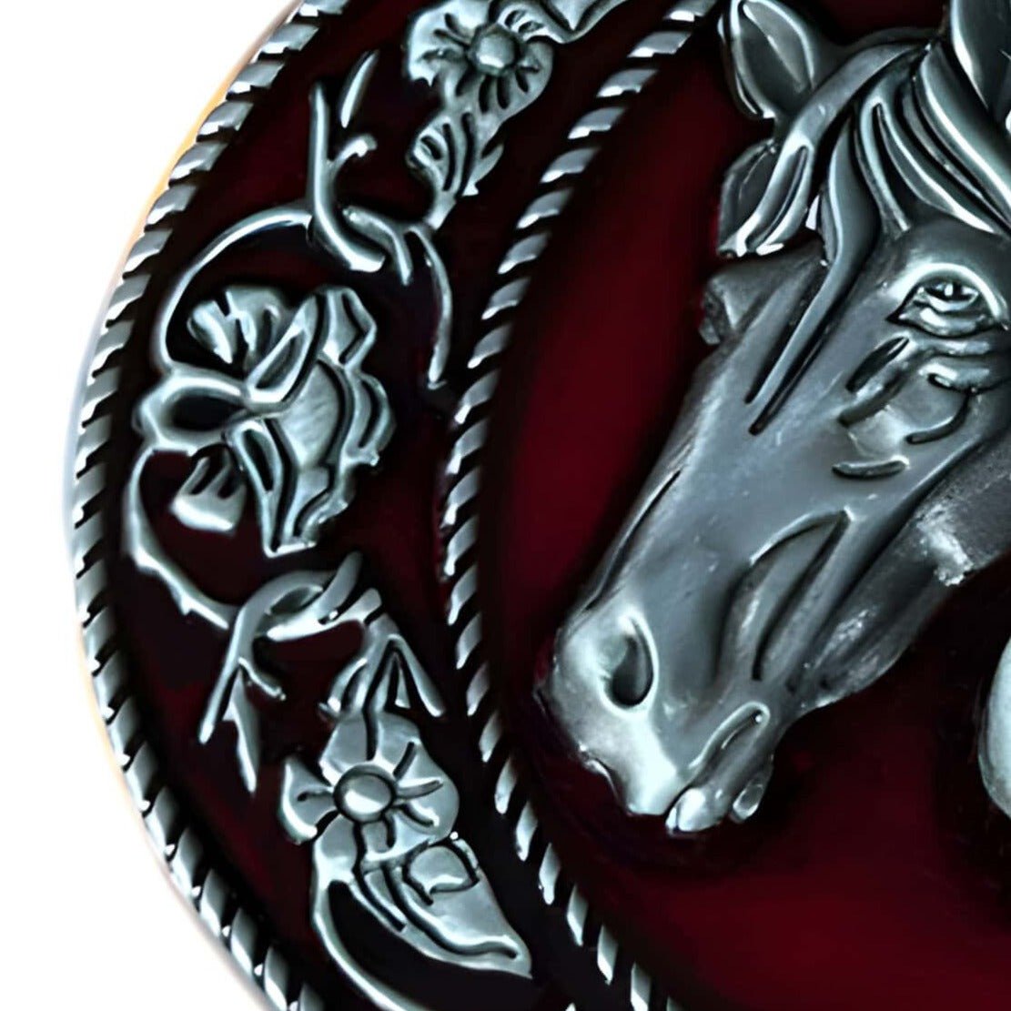 This oval belt buckle captivates the onlooker with a pair of horse heads, sculpted with striking realism, portraying a sense of companionship and strength. It is beautifully framed by a delicate floral pattern, adding a layer of grace and refinement. This piece symbolises harmony and shared strength, making it an ideal choice for those who wish to express a deep connection with these noble creatures and the spirit of freedom they represent.