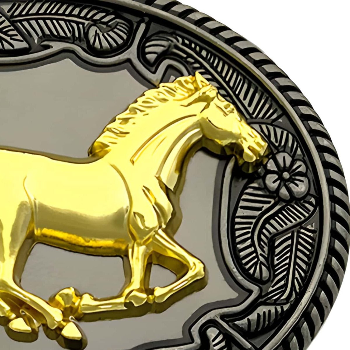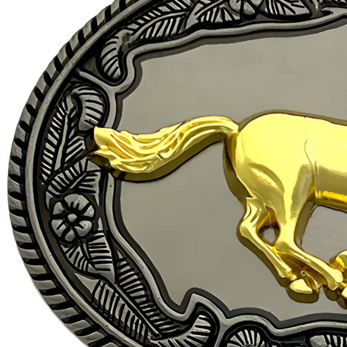 This belt buckle is a vibrant tribute to the power and beauty of a gallop, featuring a golden horse motif that appears to leap beyond its metallic boundaries. Surrounded by a finely crafted design, the contrast between the dark background and the bright silhouette of the horse creates a composition where dynamism and elegance are in perfect harmony. This accessory is a statement of style and vitality, designed to captivate attention and inspire admiration.