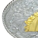The horse head, a symbol of progress and freedom, is exquisitely crafted in gold, presenting a silhouette that captures admiration and inspires desire. Encircled by a raised floral pattern, this buckle is a statement piece that appeals to those who value tradition yet stand out with their boldness. It is an accessory that promises to elevate every outfit with a touch of prestige.