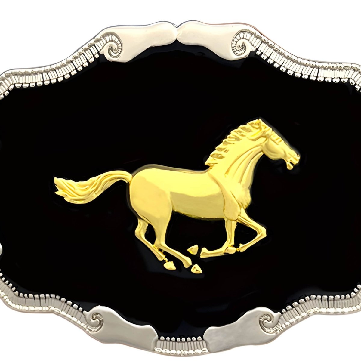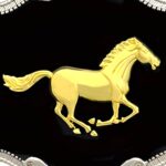 This belt buckle is a celebration of timeless elegance, epitomised by the iconic image of a trotting horse, evoking nobility and pride. The striking contrast between the dark background and the golden silhouette lends this piece an air of subtle luxury and enchanting charm. Perfect for those looking to add a refined sparkle to their wardrobe, this buckle becomes the focal point of any outfit, promising to catch the eye and garner admiration.