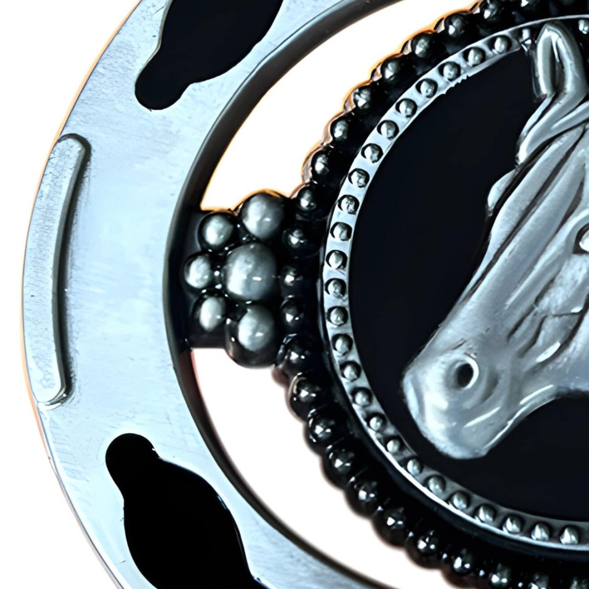 Evoking strength and determination, this buckle mirrors a design that honours tradition while incorporating a modern twist. The central motif celebrates the gentle power and majestic beauty of equines. Framed by a horseshoe, a symbol of protection and good luck, it endows its wearer with a bold and fortunate presence. Perfect for enhancing everyday attire or completing a more sophisticated look, this accessory is a must-have to effortlessly assert elegance.