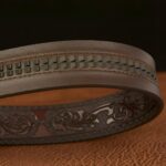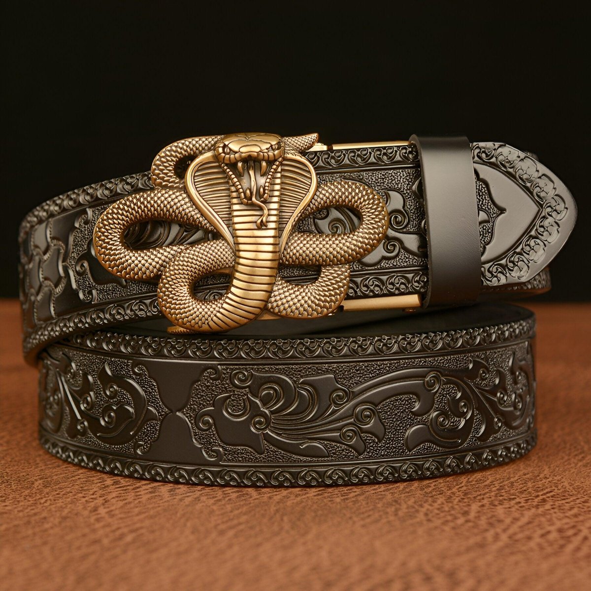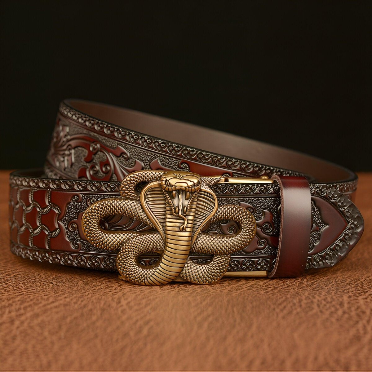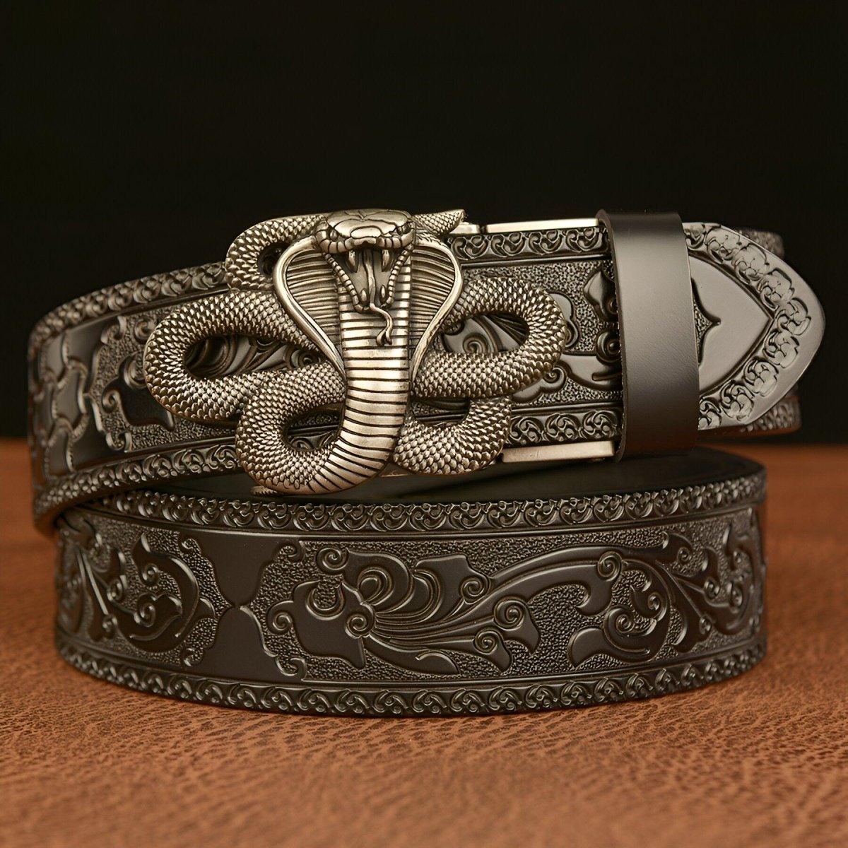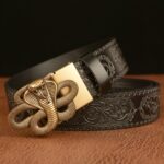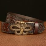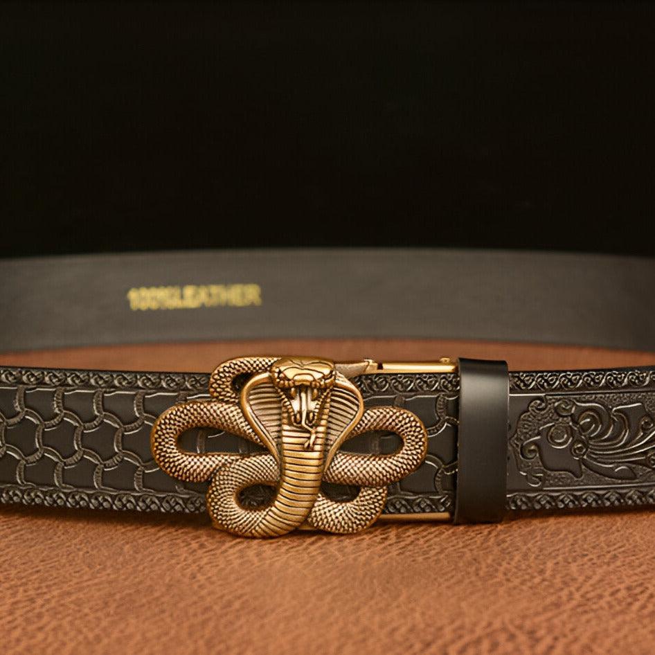 The belt is a true embodiment of power and mysticism, accentuated by the cobra that reigns over its buckle, invoking ancient deities and symbols of hidden wisdom. The meticulous craftsmanship of this serpent, a symbol of danger and allure, intertwines with the detailed and intricate engraving of the strap, mirroring ancient traditions where the cobra is revered as the guardian of mythical realms and hidden treasures.