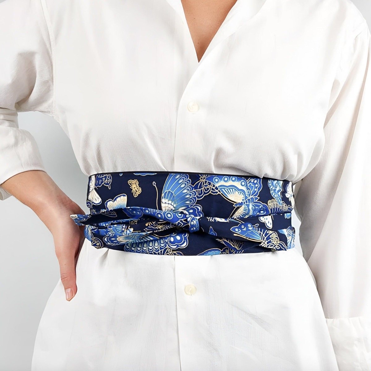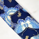 Dive into the abyss of deep midnight blue, illuminated by the flutter of butterflies delicately placed on this Obi belt. Each wingbeat is captured in a frozen dance on fabric, a ballet of shades and shapes that evoke freedom and lightness. With this piece, embody aerial elegance and let your style soar to new heights of grace and refinement.