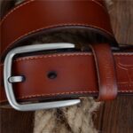 The Konstantine belt truly stands out with its bold cowboy aesthetic. It features a rounded buckle crafted from silver-toned metal alloy, measuring 6.0 cm in length and 5.4 cm in height. This buckle embodies the spirit of the Wild West, blending authenticity and character. Each time you fasten this belt, you'll be transported by its rustic heritage, while enjoying the luxury and refinement of genuine leather. The Konstantine casual belt invites you to embrace adventure with style and confidence.