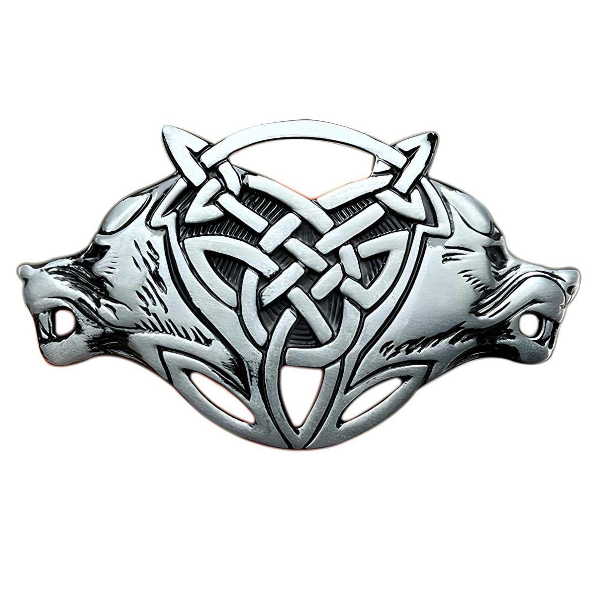 Embodying courage and power, this belt buckle featuring twin Celtic wolf heads is a true statement of strength. Each detail of this expressive design captures the noble wildness of these mythical creatures, providing an unmatched presence for its wearer. Designed for the bold spirits who resonate with the untamed essence of the wolf, it symbolizes natural leadership and an unbounded spirit of freedom.