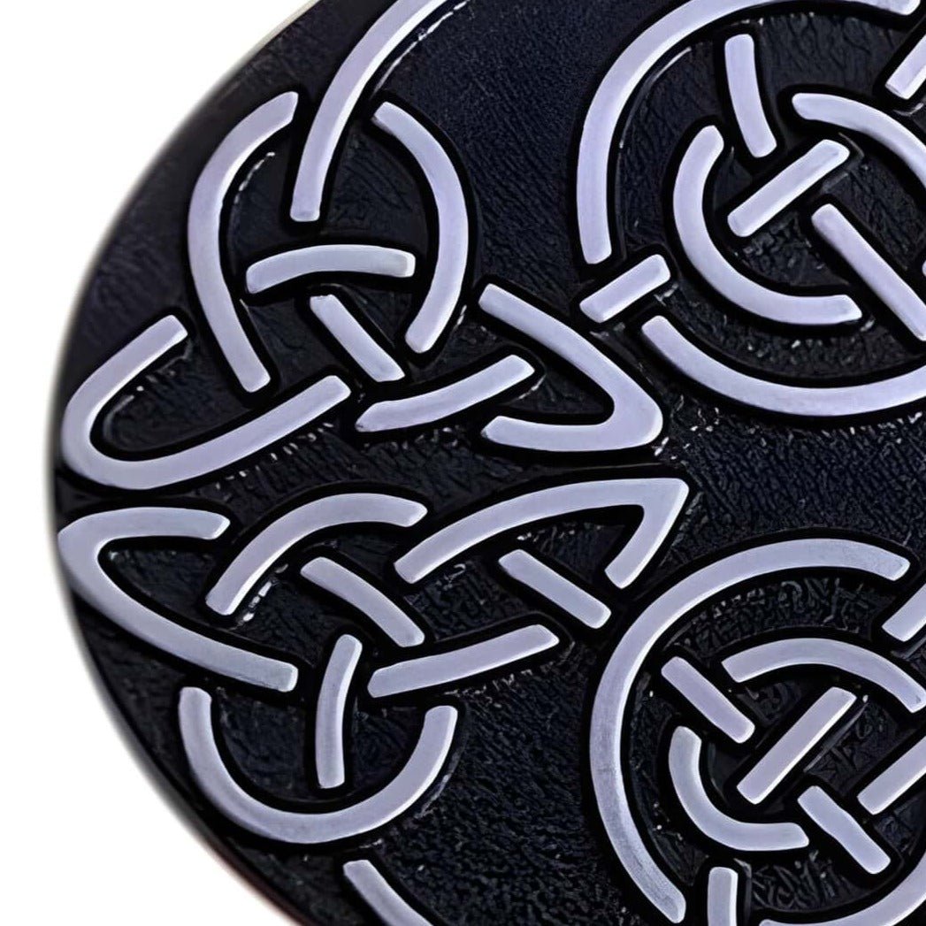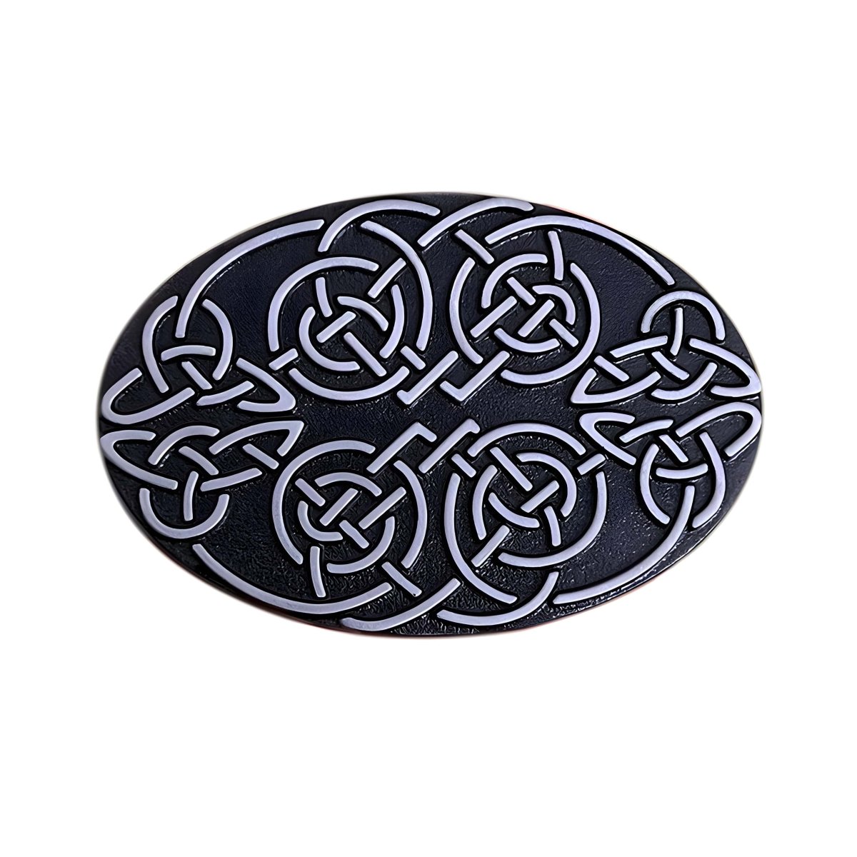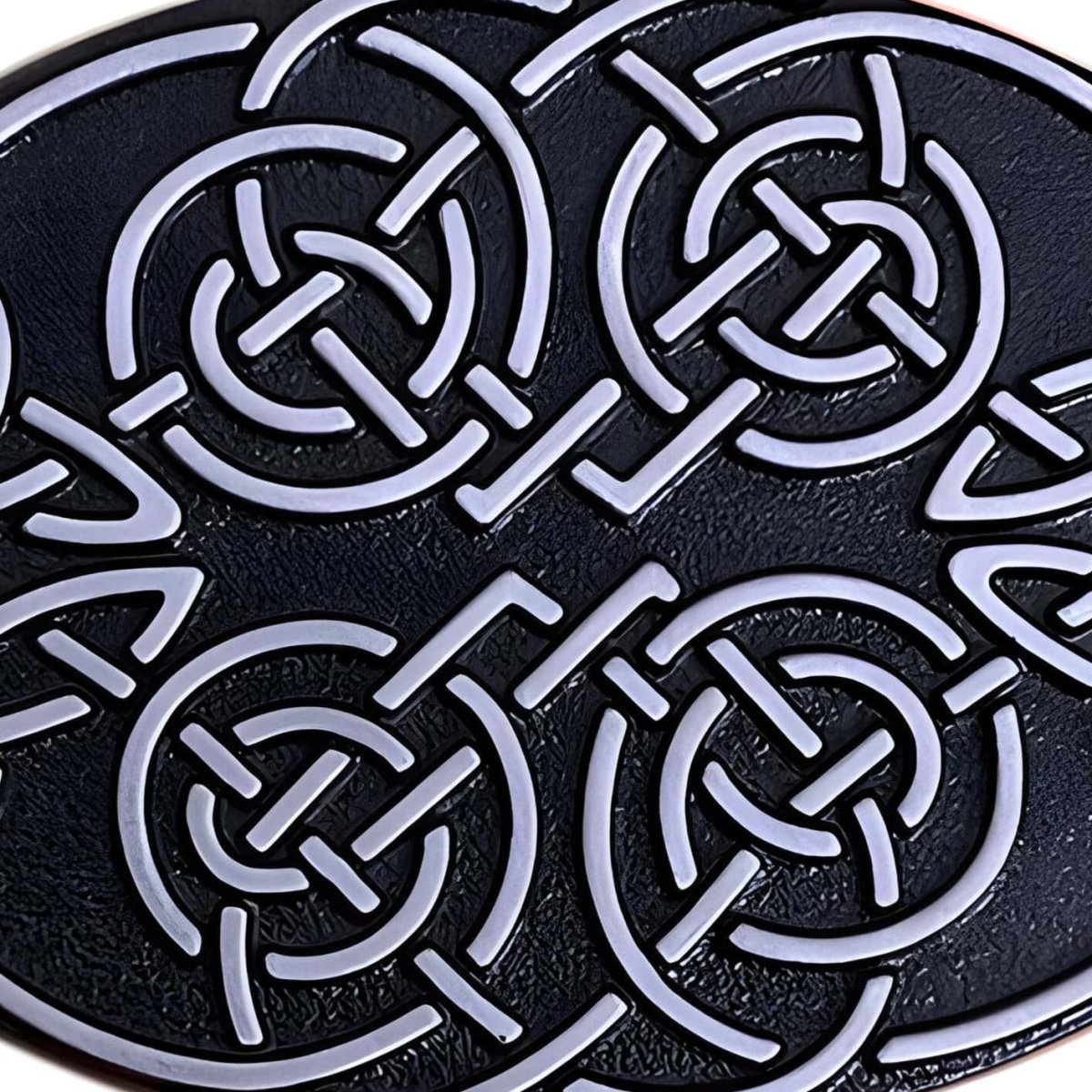 This belt buckle, crafted with exceptional craftsmanship, epitomizes the connection between ancient art and modern fashion. The precisely arranged Celtic patterns stand out against a dark background, invoking a sense of depth and mystery. Perfect for the individual with a distinct style, this piece adds a narrative dimension and visual impact to any outfit, making it essential for a wardrobe seeking distinction and character.