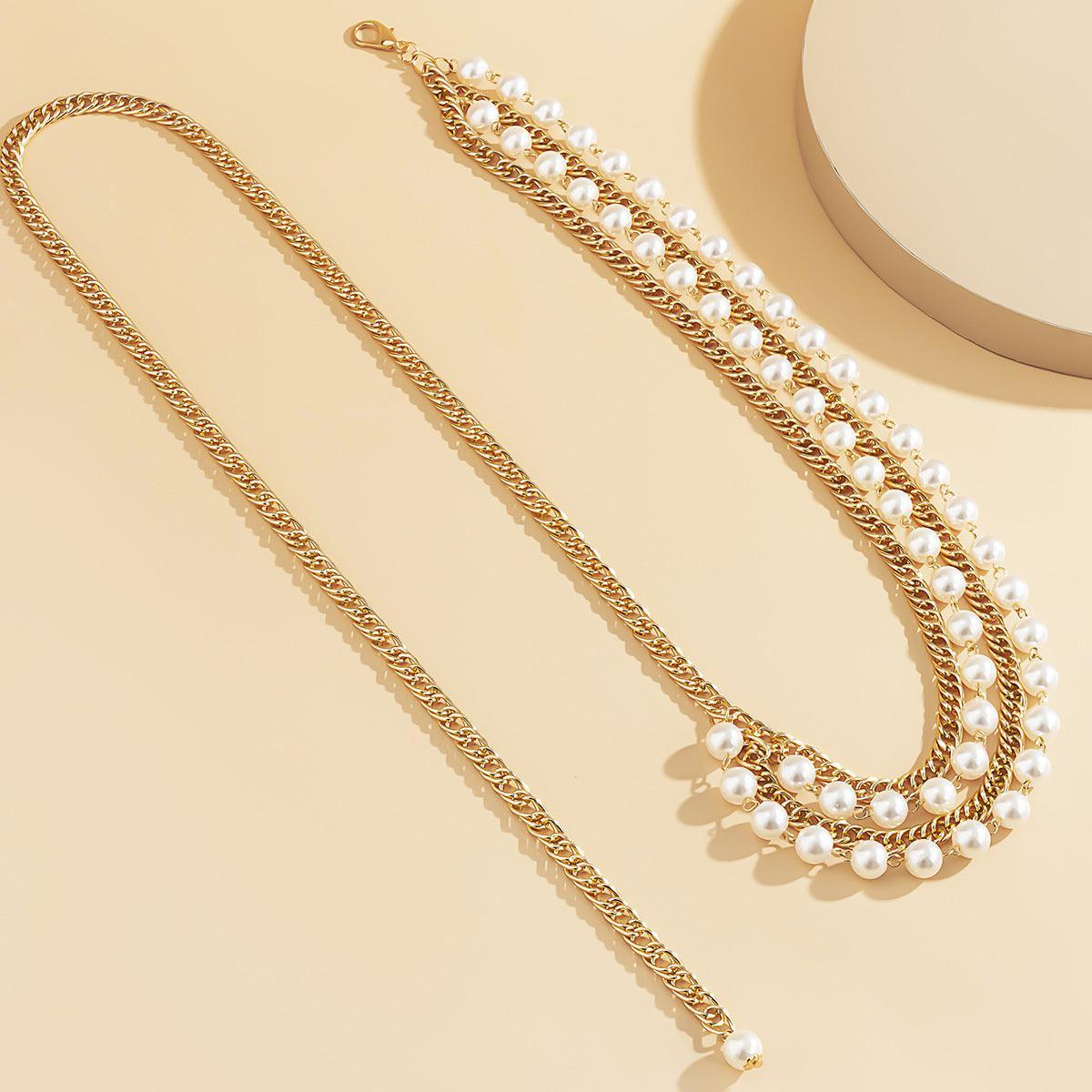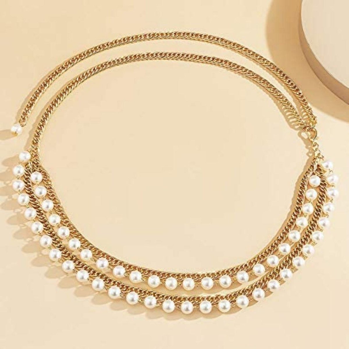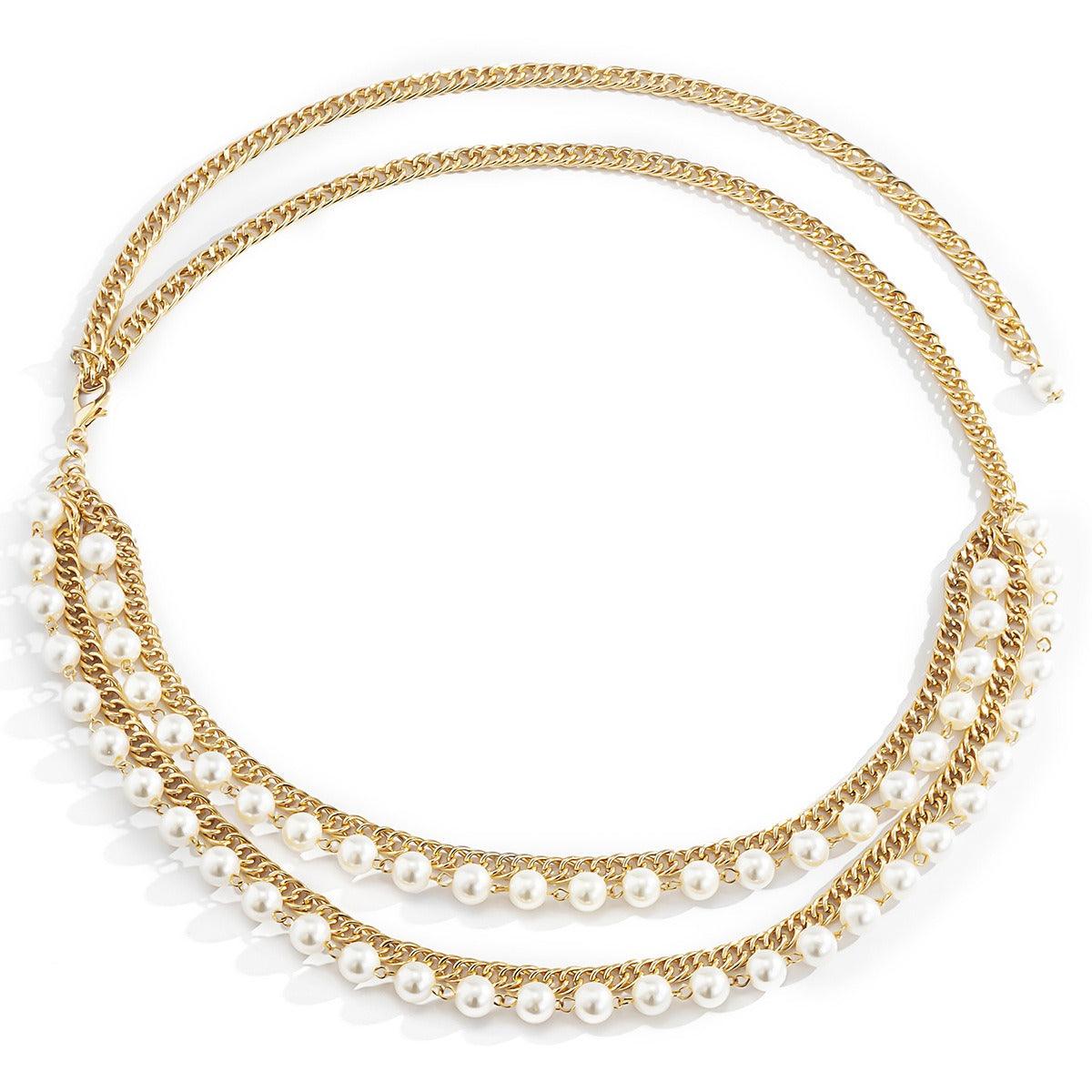 Discover the essence of style with this chain belt, a unique piece meticulously crafted to enhance your silhouette with a touch of originality. Its diverse materials and delicate beads lend an unmatched feminine flair to every outfit. The double chain row adds an extra layer of glamour and uniqueness.