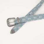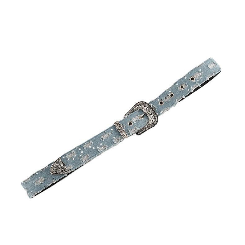 Expertly crafted, the Makenna cowboy belt in distressed denim delivers captivating Western style. Its fabric strap, elegantly embellished with sequins, adds a distinctive touch. The alloy buckle, featuring a Western motif, brings a hint of elegance and character. The stitching showcases meticulous attention to detail for an accessory that is both authentic and sophisticated.