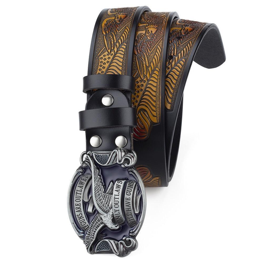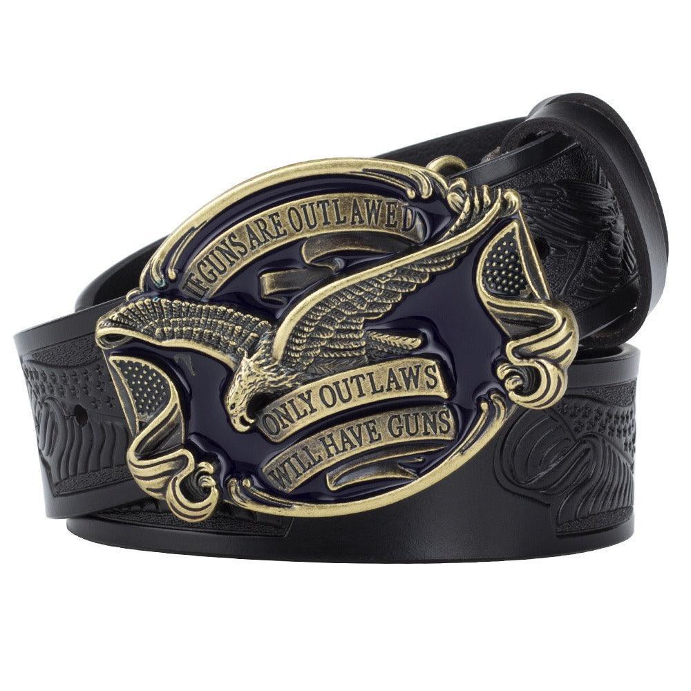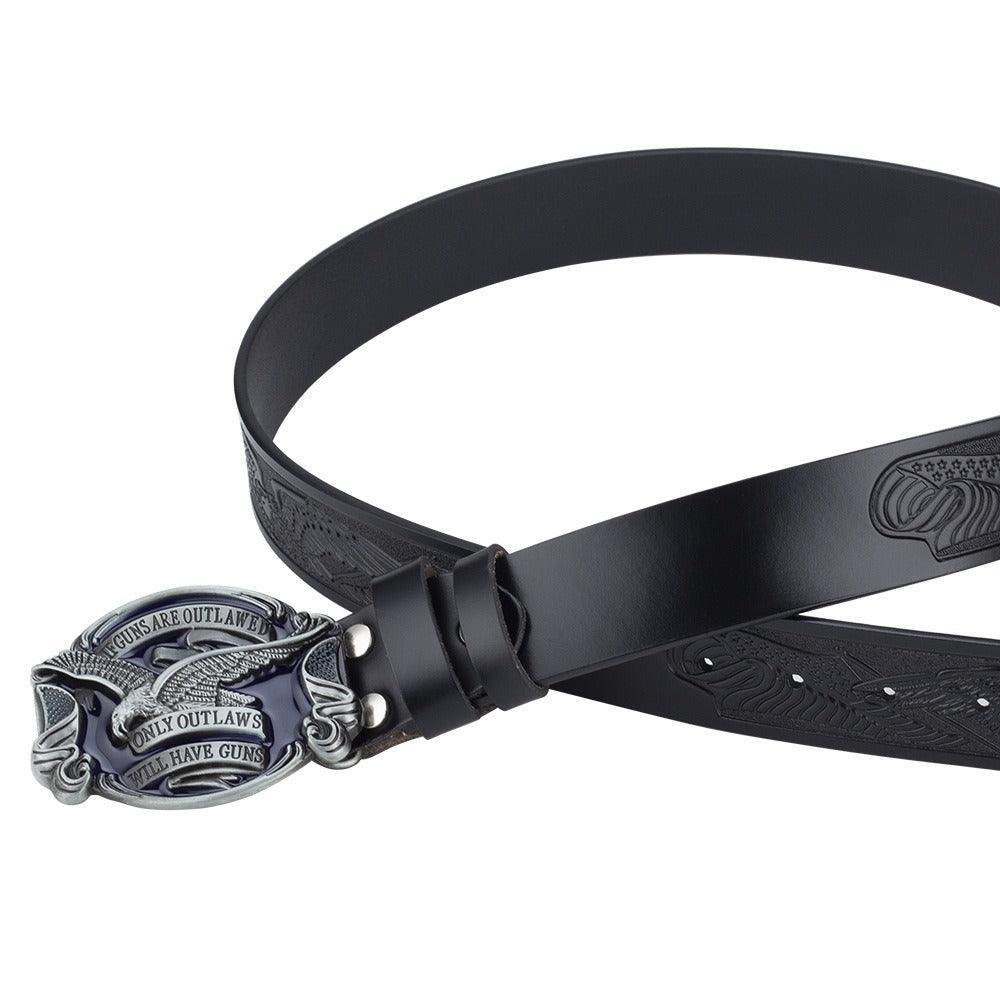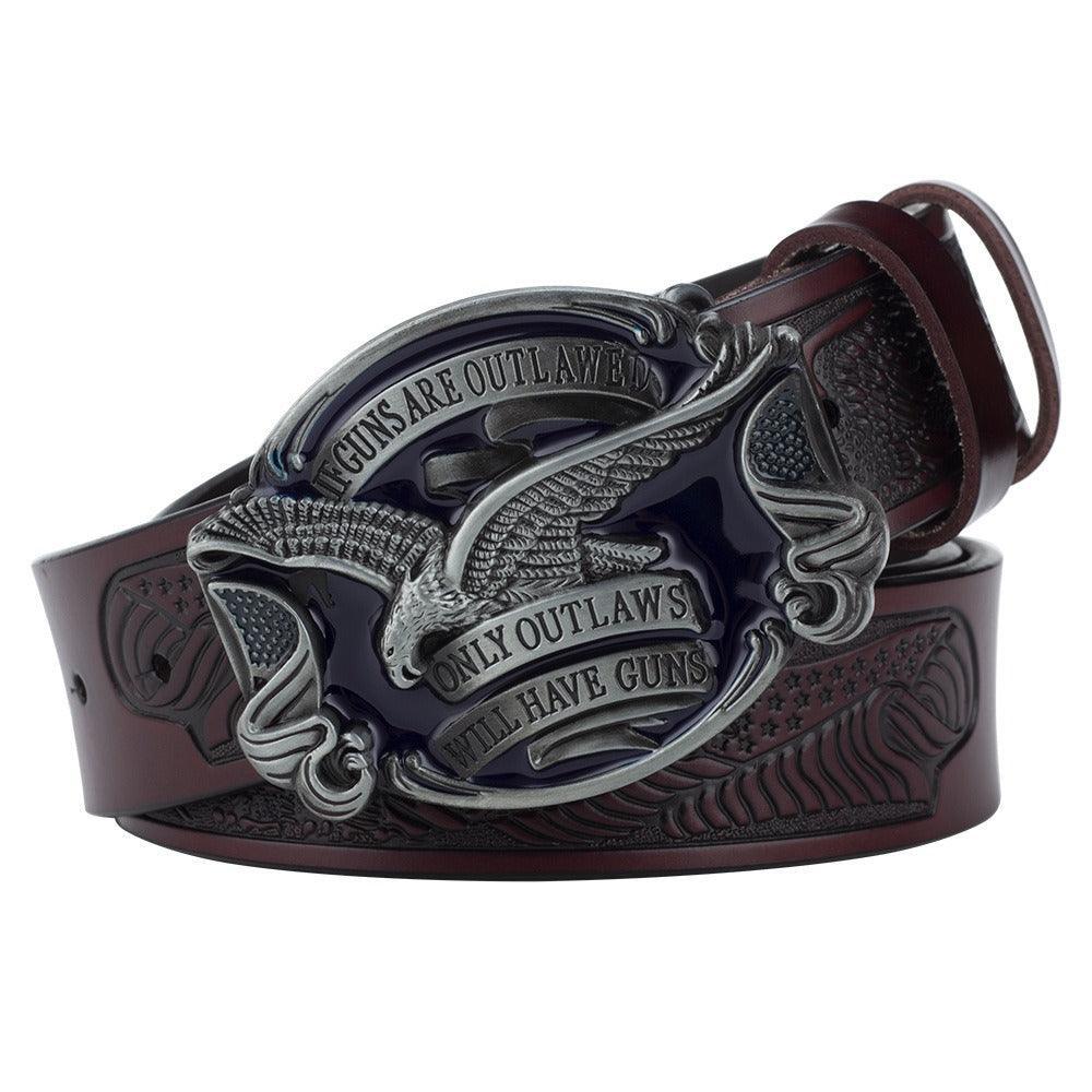 The centerpiece, a meticulously crafted metal buckle, features a majestic eagle, emblematic of strength and freedom. This is more than just an accessory; it's a statement—a tribute to those who express themselves without uttering a single word. Slip on this cowboy belt to elevate an ordinary outfit to an extraordinary ensemble, letting your style speak volumes about your distinctive personality.