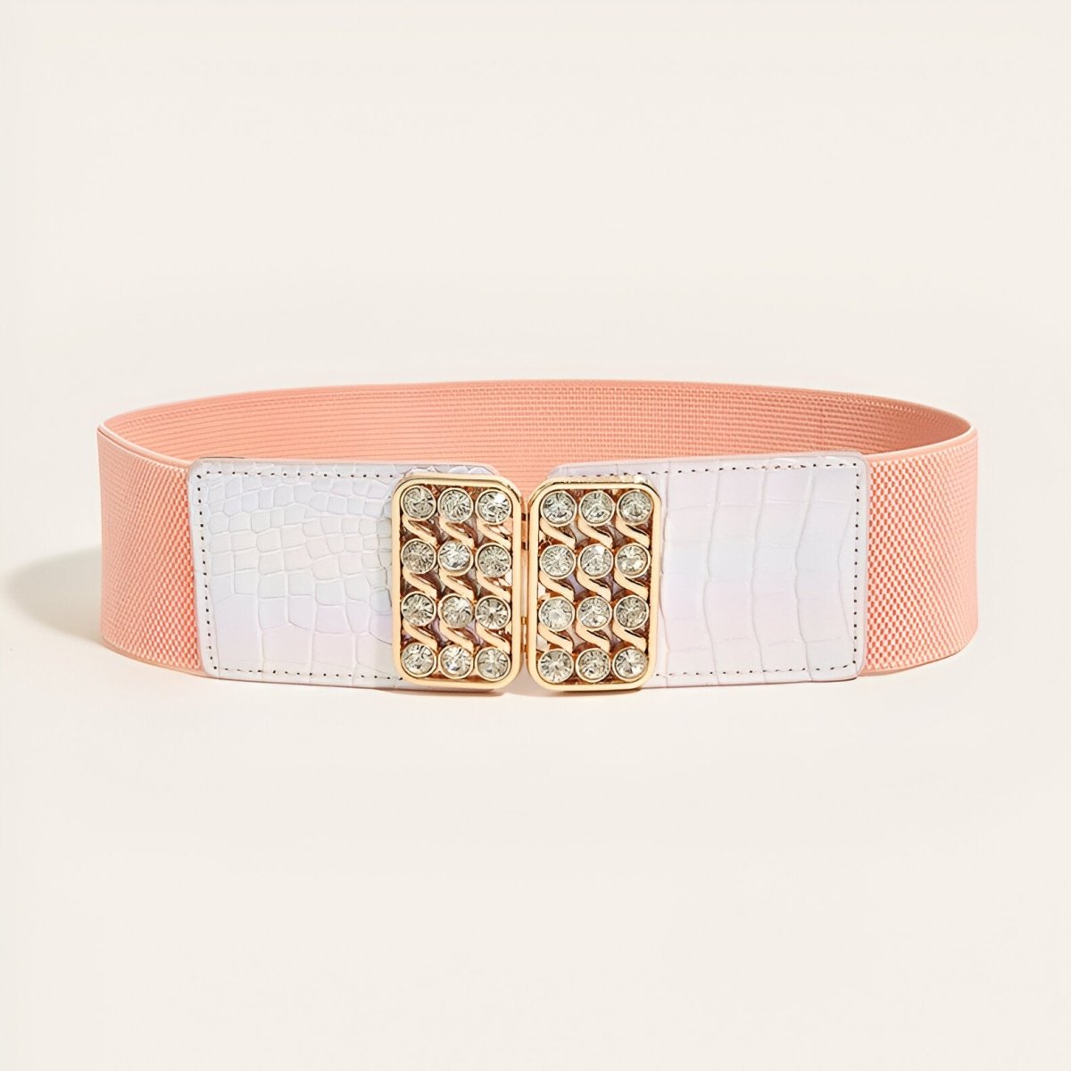 The Miranda model dazzles with its golden hook buckle, blending a classic round shape with a delicate pattern, casting a warm glow on every outfit. The 6 cm wide strap provides secure support and a visual presence that's noticeable without being overpowering, allowing this stretch belt to integrate seamlessly into everyday wear with remarkable ease. Whether paired with a cosy cardigan or a flowing skirt, the Miranda promises an elevated style and a bold presence.