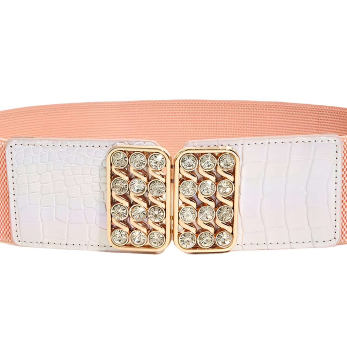 An elegant belt with a beautiful buckle and pearlescent strap to emphasise your waist.