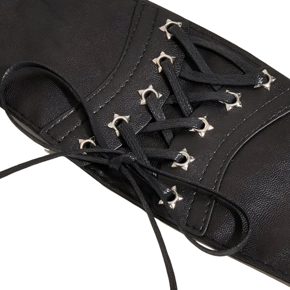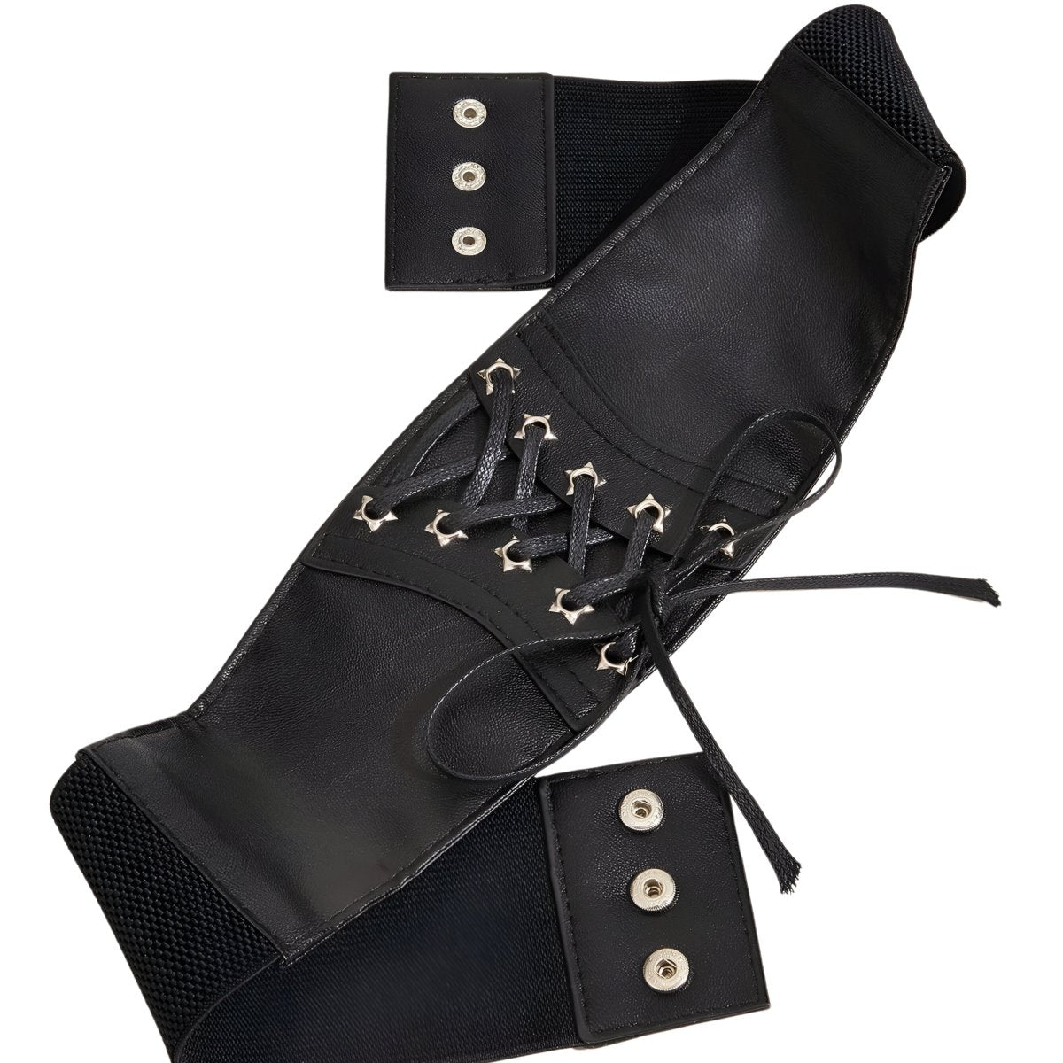 With its bold yet elegant design, the Elowen corset belt is an essential accessory for shaping and enhancing the figure. Crafted from a clever blend of Vegan Leather and stretch fabric, it provides unparalleled comfort while ensuring flawless support. The textured design of the strap adds a unique tactile dimension, while the finish with star-shaped rivets and a satin cord reflects an unmatched attention to detail. Perfect for wearing over trousers, a skirt, a dress, or even a jumpsuit, this belt is sure to stand out and be cherished for its distinctive character.