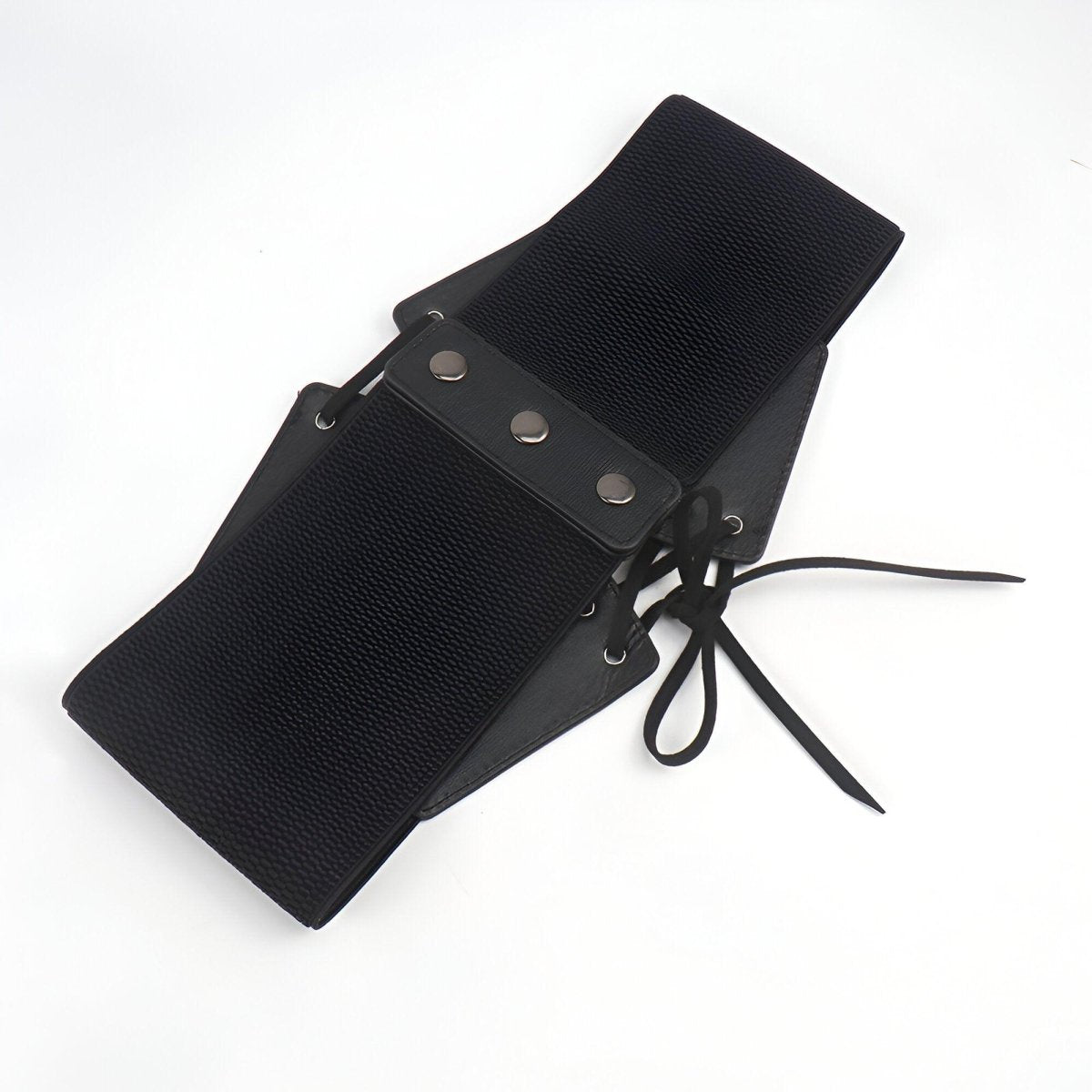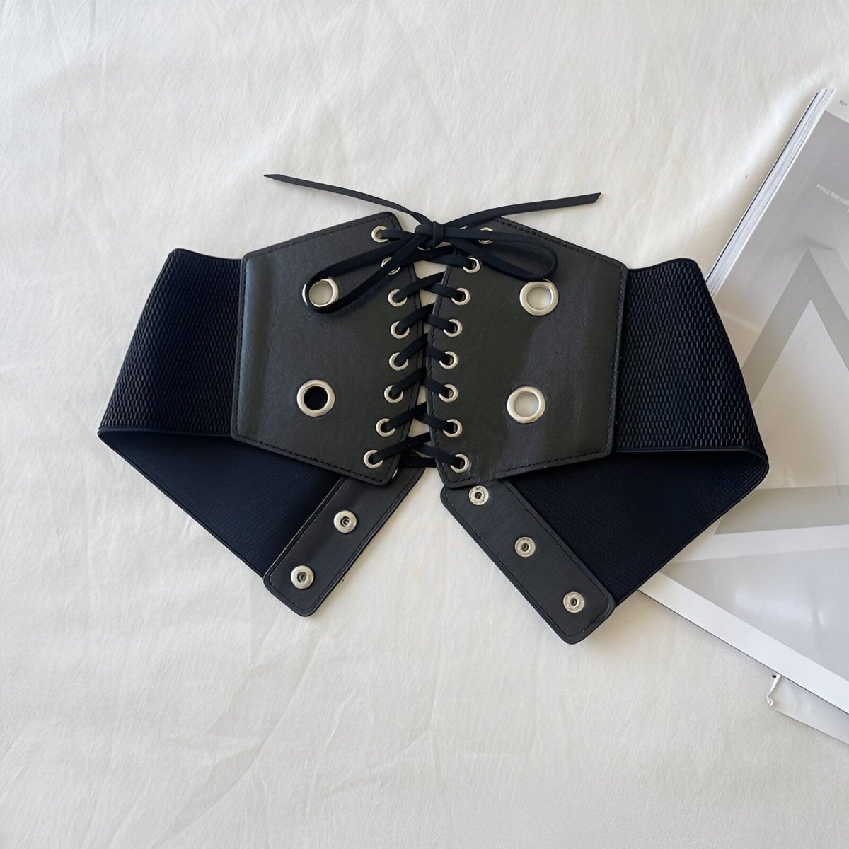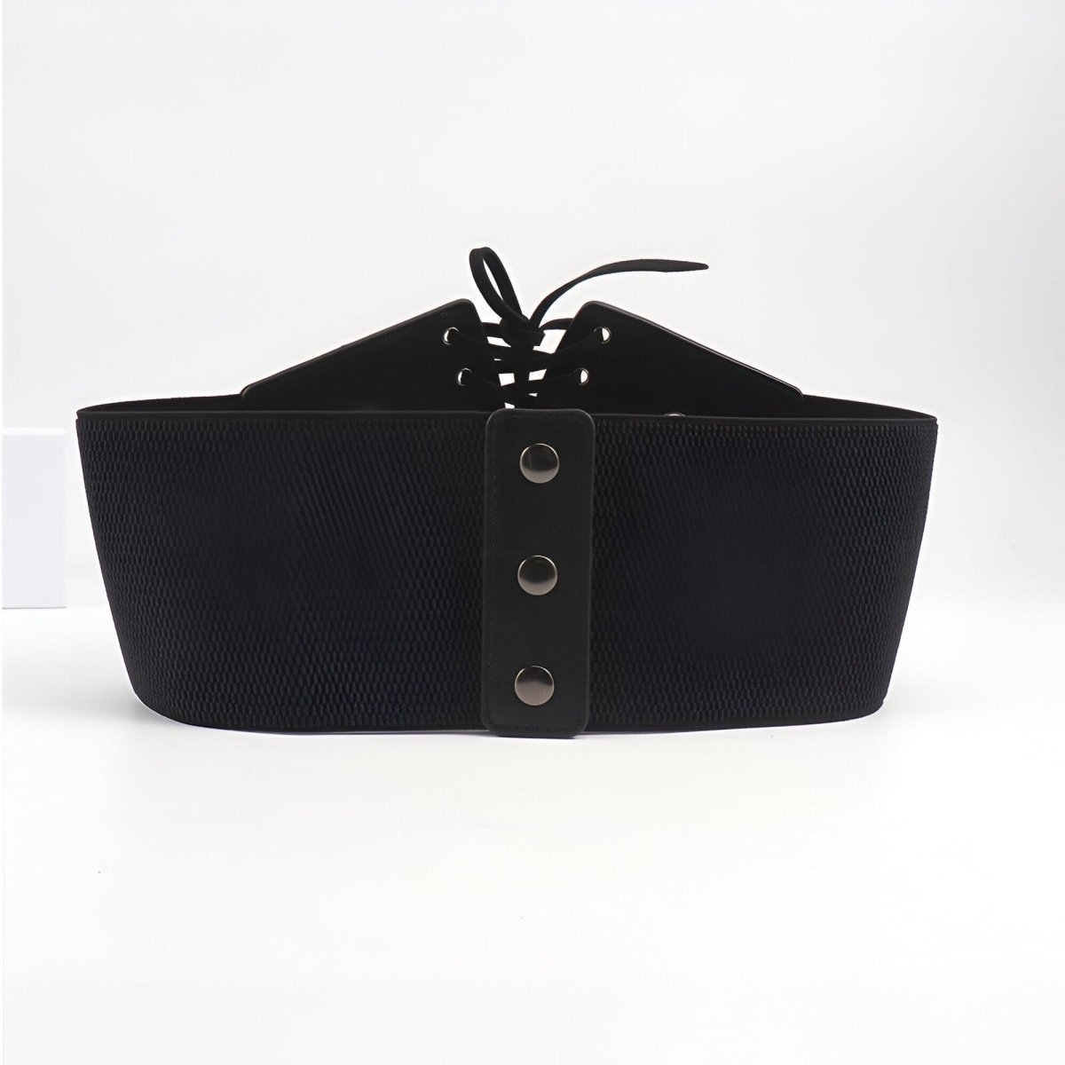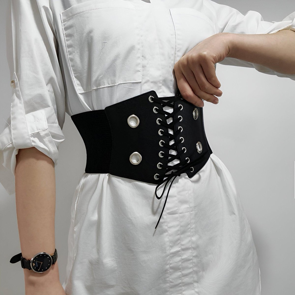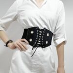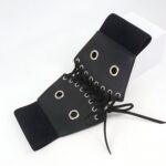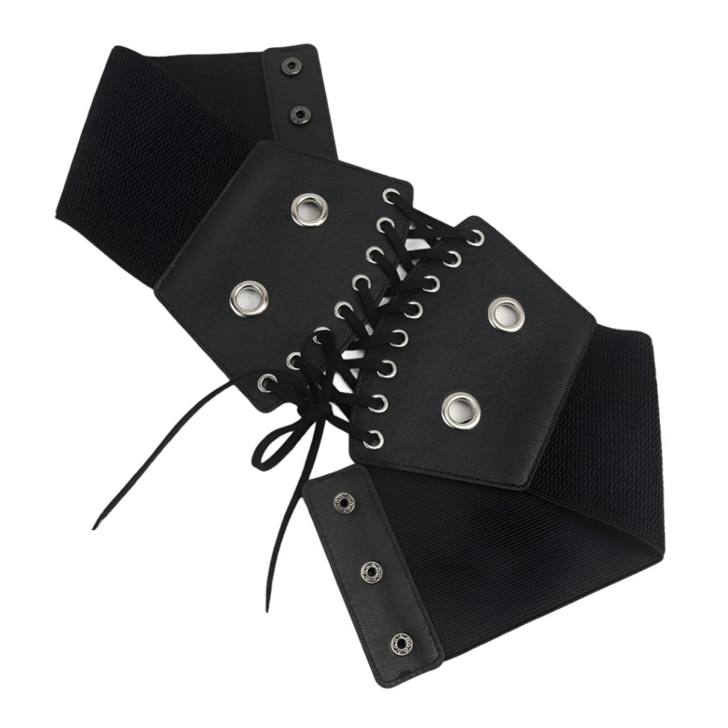 Embodying the power of contrast, this corset belt captivates with its bold and sleek aesthetic. The central lacing, a true highlight of the design, unfolds across a dark canvas, punctuated by the metallic shimmer of eyelets. This piece promises to redefine the waist with a strong visual presence, while providing adaptability and comfort that hug and flatter the silhouette with every move.