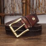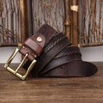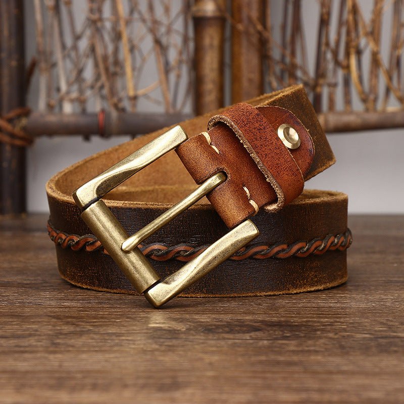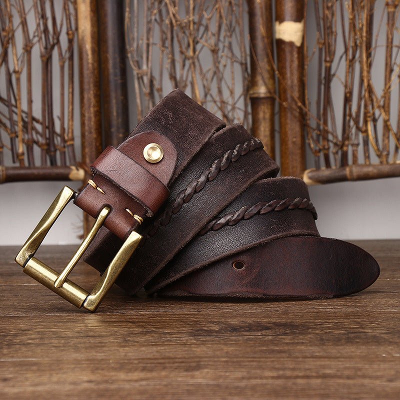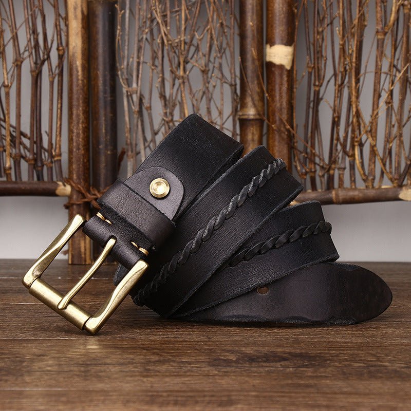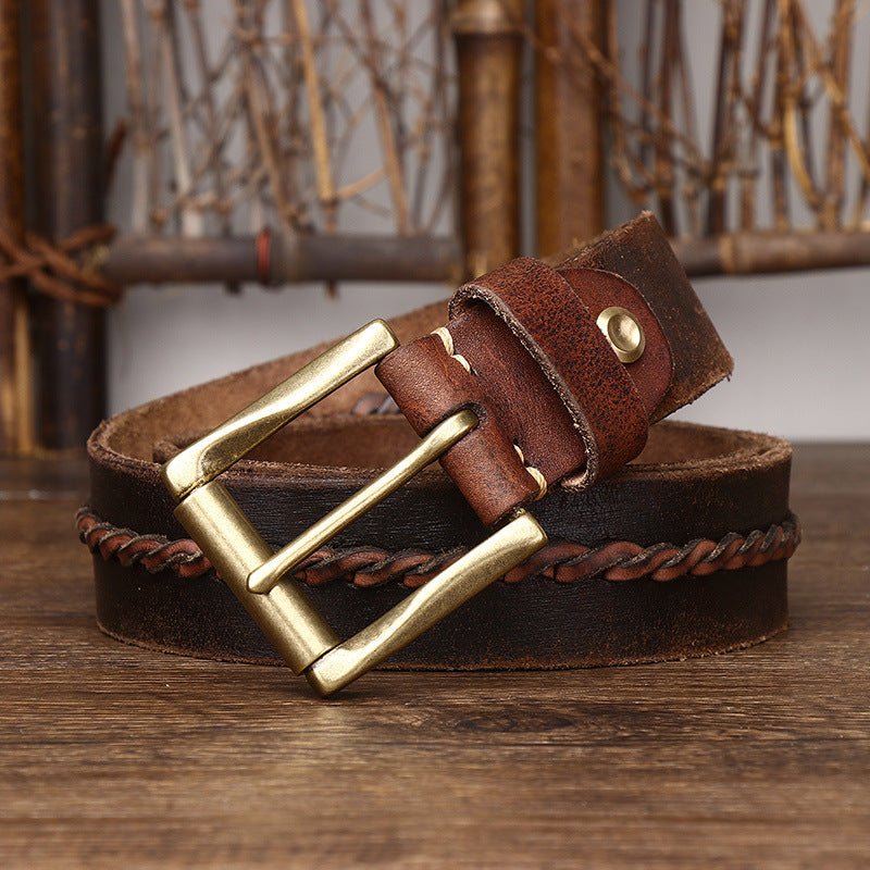 Introducing a dimension of understated refinement to the realm of men's accessories, the leather belt transcends its basic function of support to become a reflection of poise. The distinctive and bold braided centre strap breathes a spirit of originality and sophistication into the piece. This union of durability and aesthetic appeal is strikingly punctuated by a solid brass gold-tone roller buckle, enhancing the design with unparalleled elegance. This leather accessory is draped in subtle elegance, capable of adding a warm touch to the most understated outfits.