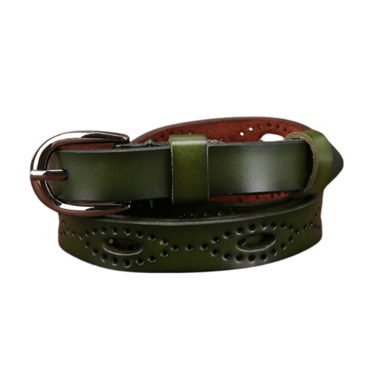 The Caia belt is designed for women who are conscious of their style and wish to blend chic with a touch of boldness. Crafted from cowhide leather, this belt showcases a refined taste for quality materials. Its perforated strap, adorned with delicate cut-outs, pairs perfectly with its timeless rectangular buckle. Available in various shades, from vibrant red to deep khaki, the Caia can be matched with a range of outfits, whether it's casual jeans or formal trousers.
