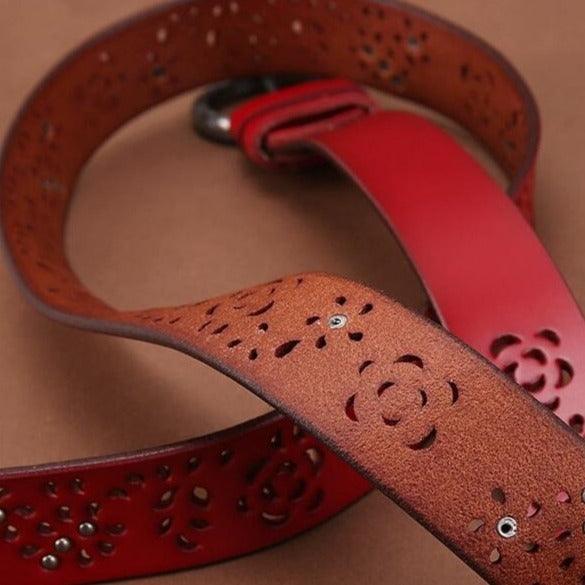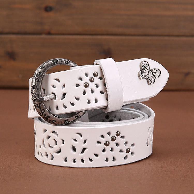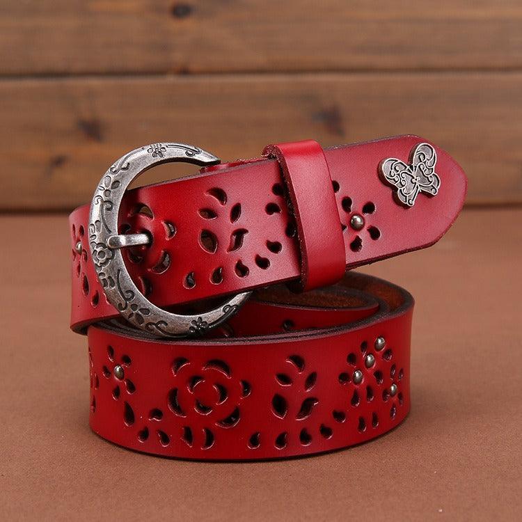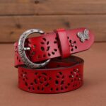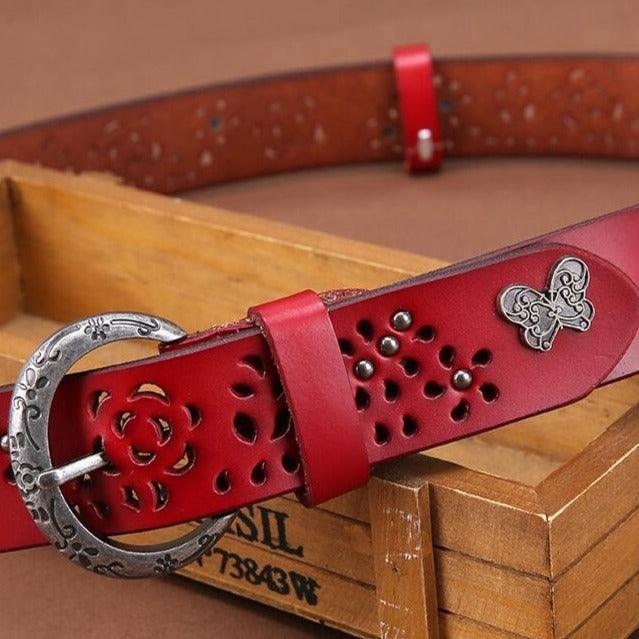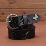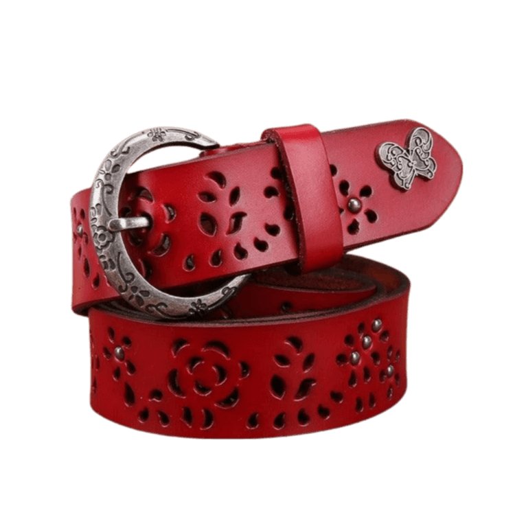 At the intersection of art and accessory, this suede leather belt commands attention with grace and elegance. The nature-inspired cut-out patterns blend a classic and contemporary aesthetic. The buckle, adorned with subtle motifs, adds a distinct character, while the butterfly detail provides a unique visual signature. Both functional and decorative, this piece celebrates feminine elegance, complementing an array of outfits from casual to sophisticated.