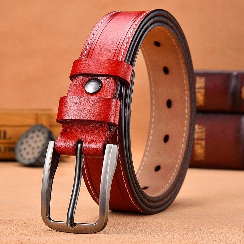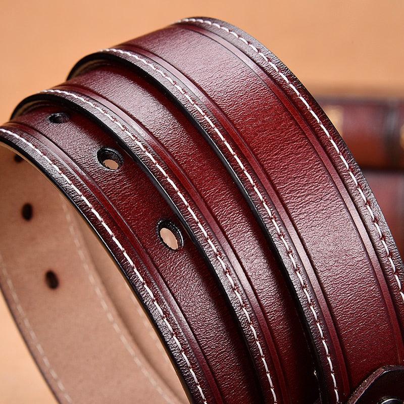 Immerse yourself in understated luxury with the Nestani model women's belt. Its sophisticated design, featuring a stunning leather strap, enhances your figure while adding a chic touch. The smooth finish and striking white stitching give it a unique aesthetic, injecting a dash of vibrancy into your everyday style. These bright stitches subtly contrast with the strap's colours, from deep black to bright red, and from rich coffee to warm cognac and pure white.