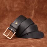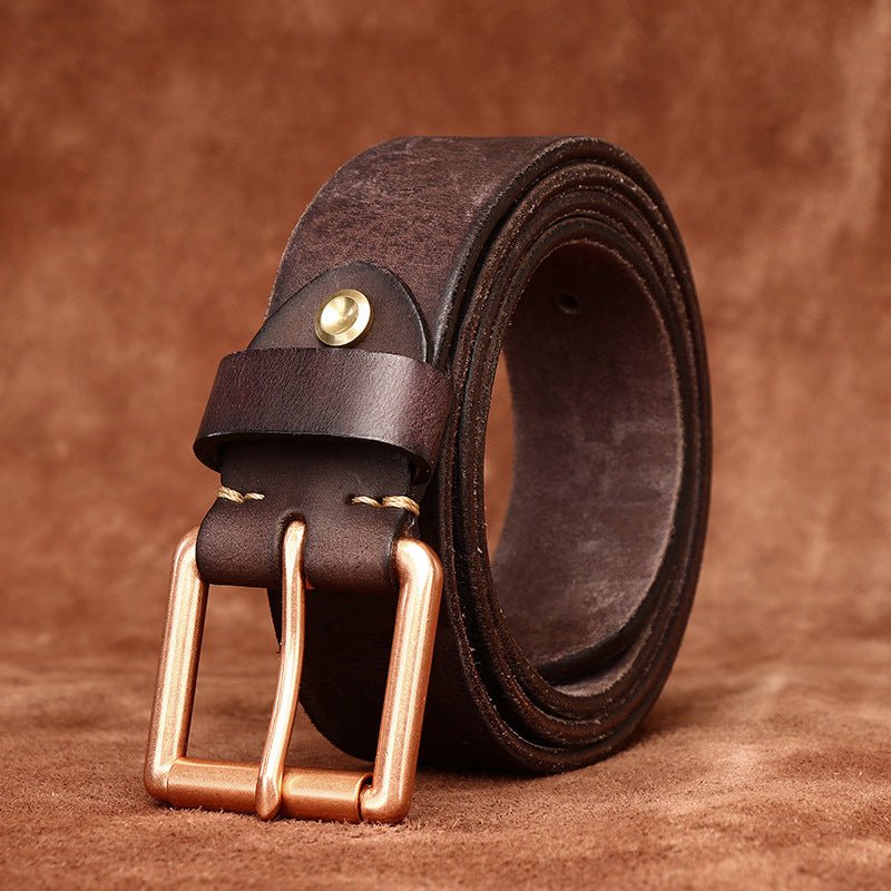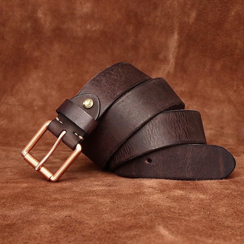 This piece is crowned with a solid brass square buckle, whose rose gold sheen is a hallmark of refined taste. The 4.0 cm width of the strap strikes a perfect balance between durability and elegance, making it an ideal choice for enhancing a well-fitted pair of jeans or tailored trousers. The combination of premium materials and meticulous design renders this belt an essential accessory in the collection of those who value quality and style.