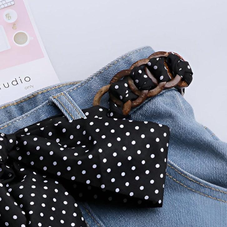 The Lisbeth scarf belt is a nod to classic elegance with a touch of modern whimsy. Crafted from pure silk, this accessory features a timeless polka dot pattern softened by coconut wood rings that lend an organic dimension to the design. Each handmade knot creates a graceful silhouette, offering an aesthetic that is both traditional and cutting-edge.