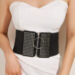 Embrace the boldness of the Margaret Model, a cutting-edge corset belt. The fusion of vegan leather and stretch fabric gives this design flexibility to contour perfectly while offering supreme comfort. The addition of meticulously placed metallic embellishments adds a subtle yet striking sparkle, drawing the eye. With its straightforward stitching, this model ensures a flawless fit without compromising on durability.