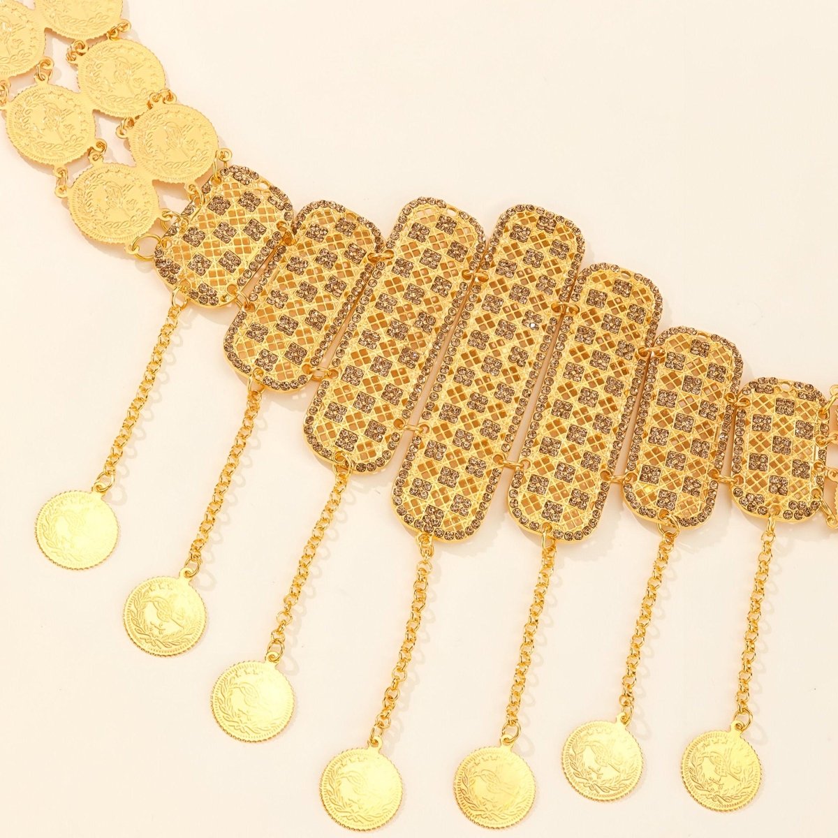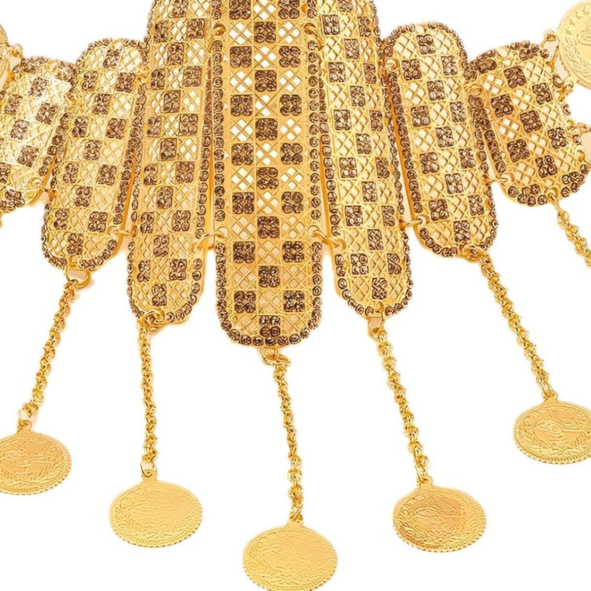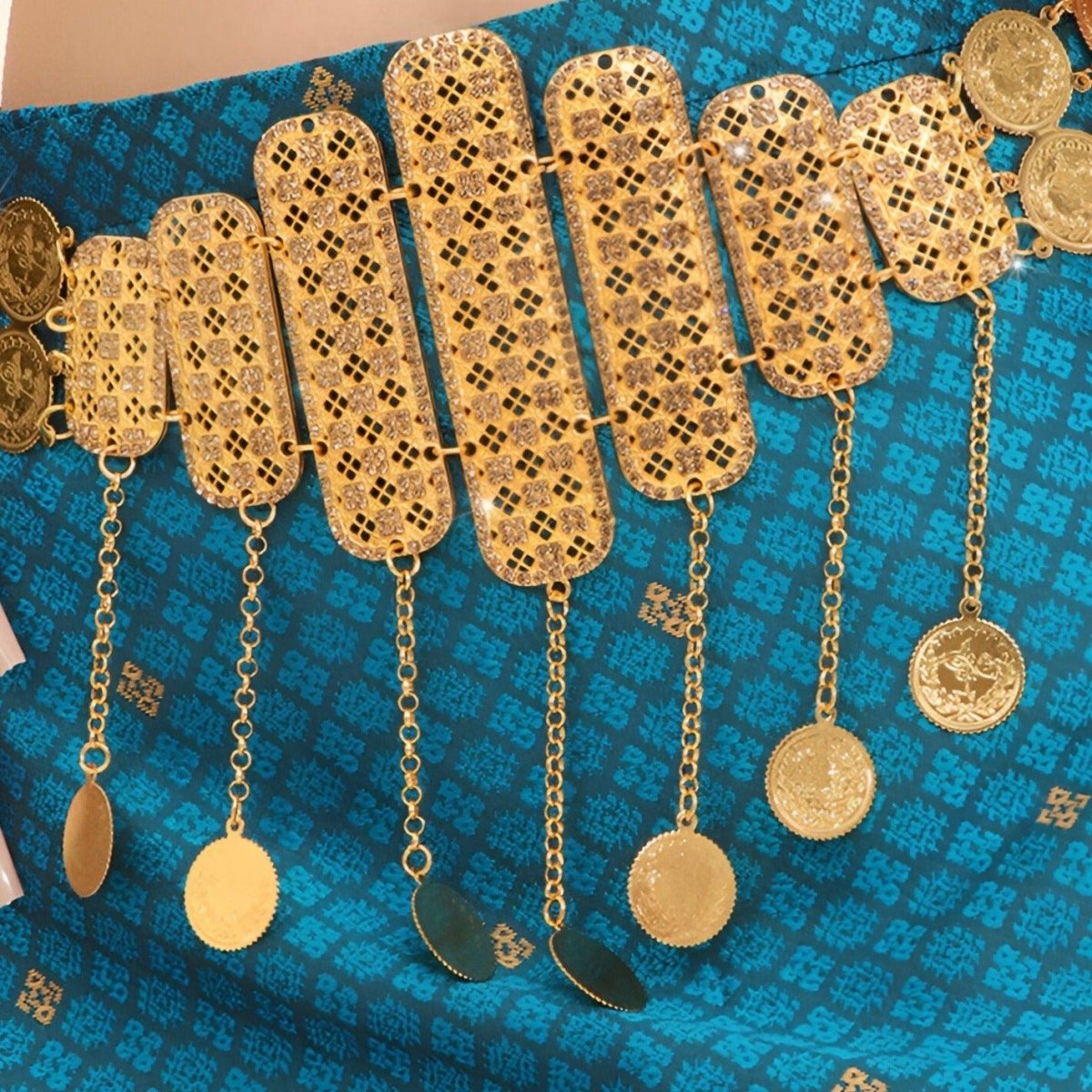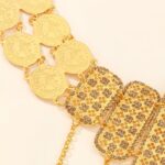 The "Golden Reflections of the Souk" Moroccan Belt is a celebration of Moroccan lifestyle, capturing the essence of bustling markets and ornately decorated riads. Each gold-plated panel, meticulously perforated, reflects the intricate details of lanterns, while the dangling medallions mimic the soft jingle of coins in the vibrant alleys of Marrakech.