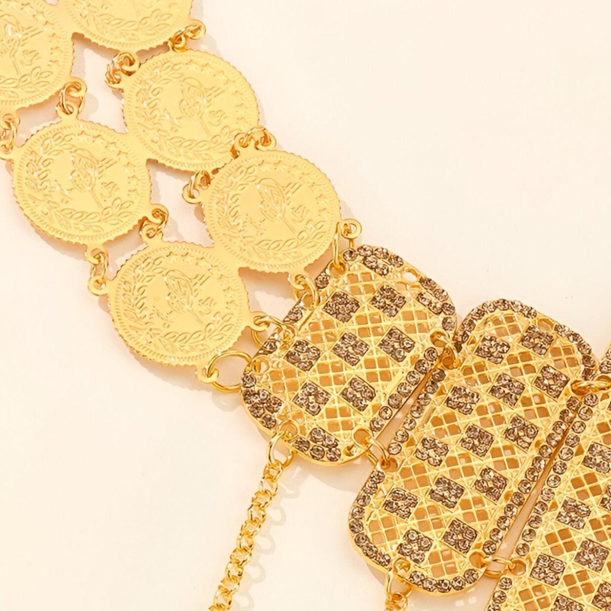 Moroccan Belt in Gold with Checkered and Medallion Patterns, Heya Model