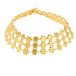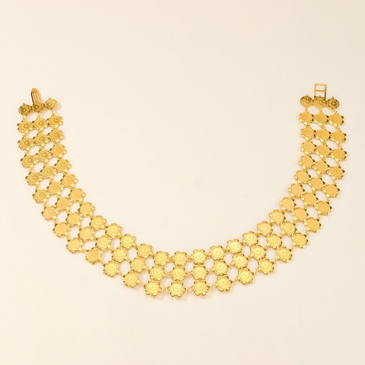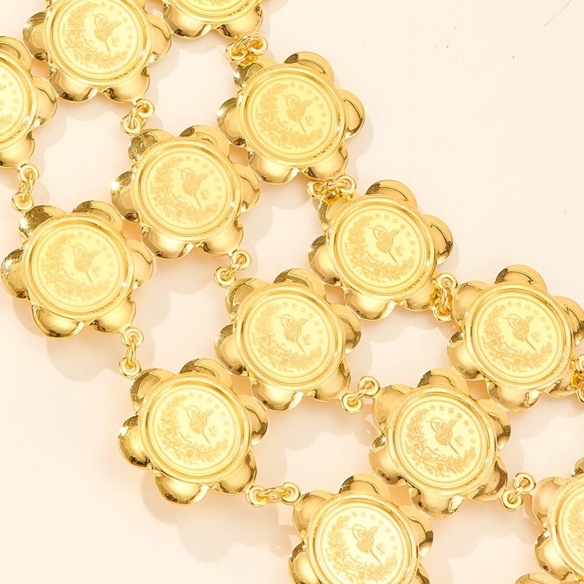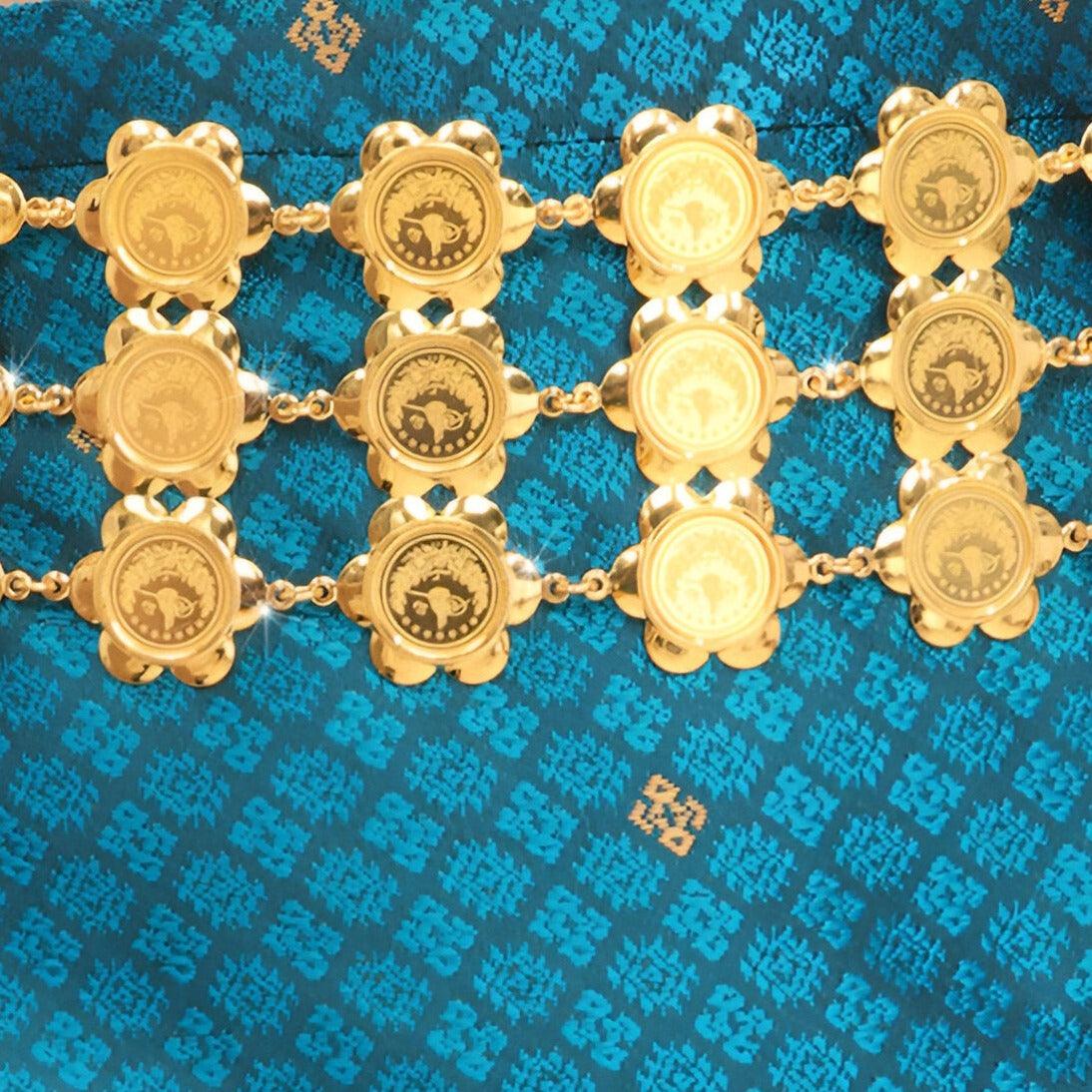 Capturing the essence of lavish celebrations, this Moroccan belt, named 'Diadem of Moroccan Heritage', pays tribute to the opulence of traditional festivals. Its golden medallions, embossed with iconic motifs, are arrayed in an adornment worthy of the grandest households, reflecting light and history with every graceful movement.