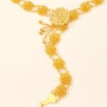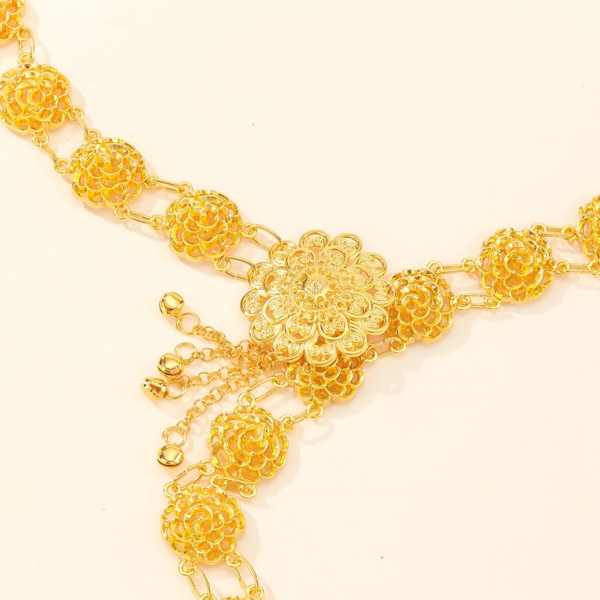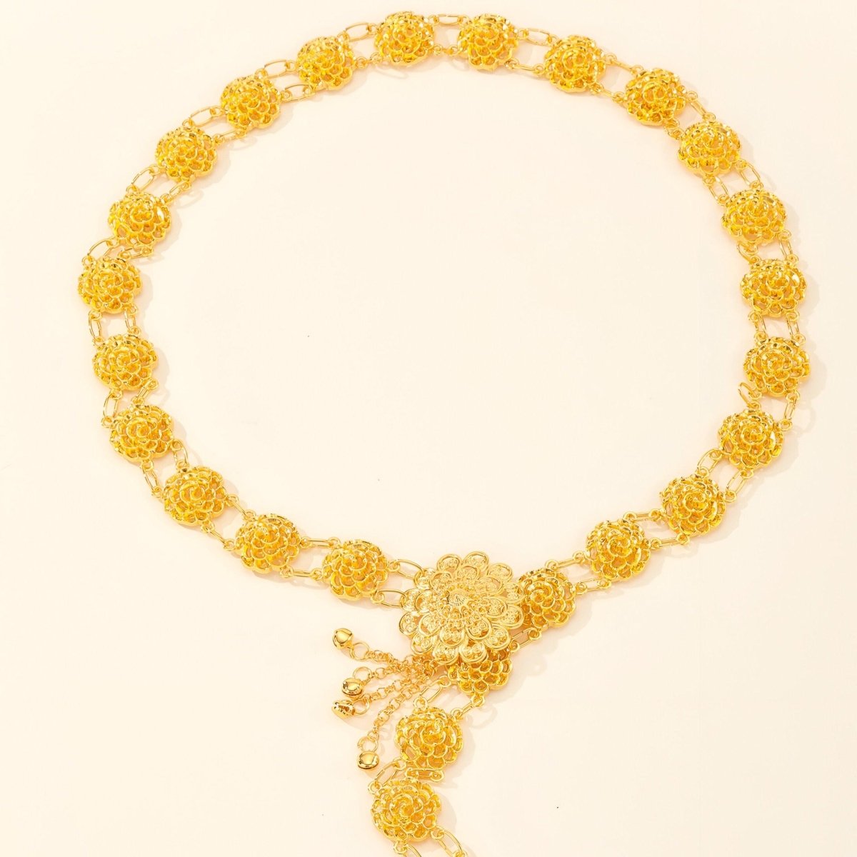 Borrowed from the opulence of the Moroccan royal court, this belt is a revelation of splendor. At its centre, a gold floral medallion, crafted with masterful skill, immediately catches the eye, reminiscent of the ornaments that once adorned the nobility. Surrounding this centrepiece, a series of delicate motifs in the shapes of flowers and filigree stars unfold, creating a line of pure beauty that encircles the waist with unparalleled elegance.