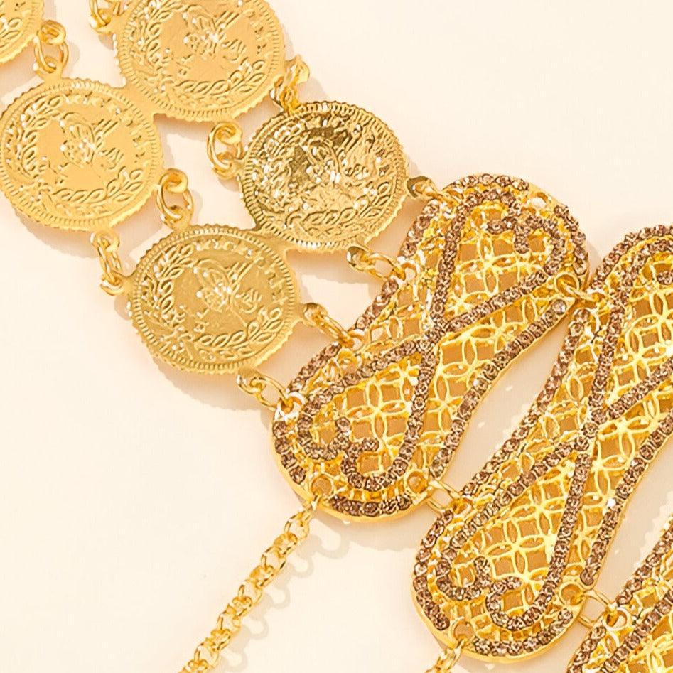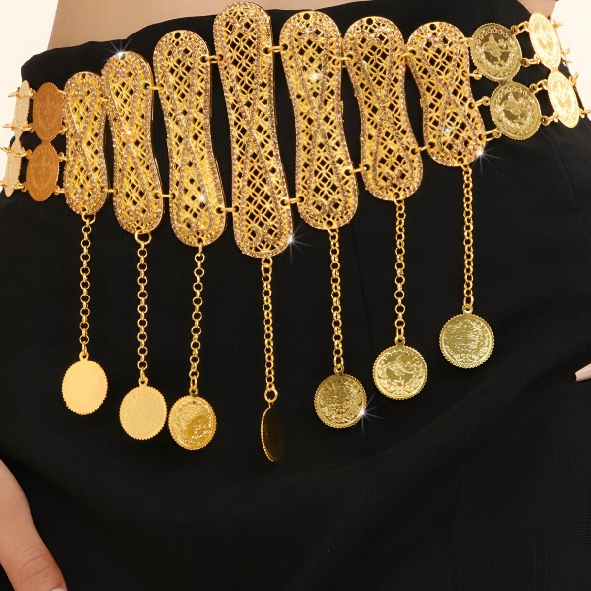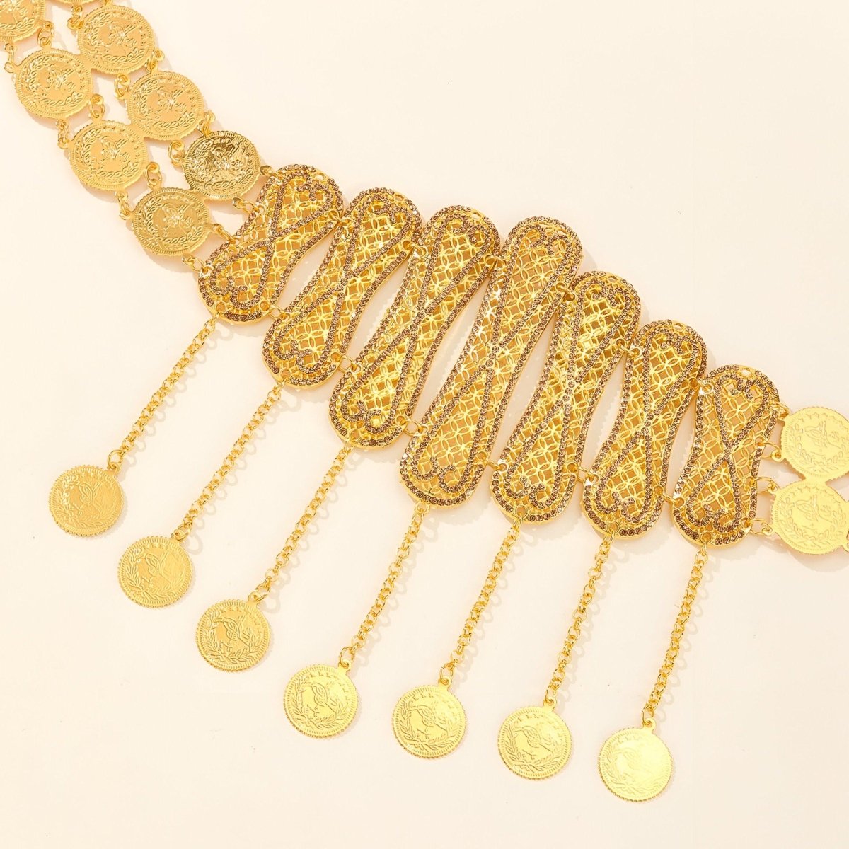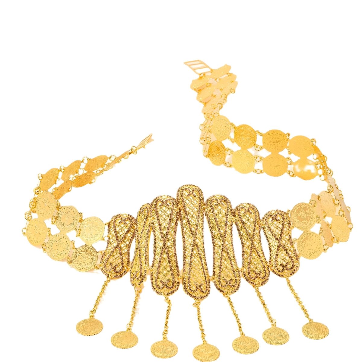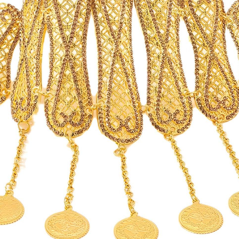 This accessory is more than just a belt; it is a tribute to Moroccan celebrations, where every detail celebrates the culture. The golden pieces, reminiscent of ancient coins, symbolize prosperity and joy, enhancing the steps of dancers in brightly lit riads. This Moroccan belt, adorned with exquisite patterns and chains that catch the light, is designed for occasions where tradition is dressed in grandeur—perfect for weddings and celebrations where every movement paints a vivid picture of elegance and history.