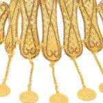 Cette ceinture marocaine est un hommage vibrant aux motifs traditionnels et à l'élégance, avec ses plaques dorées finement ouvragées suspendues en cascade, ajoutant un rythme visuel et une sonorité délicate à toute tenue de cérémonie.