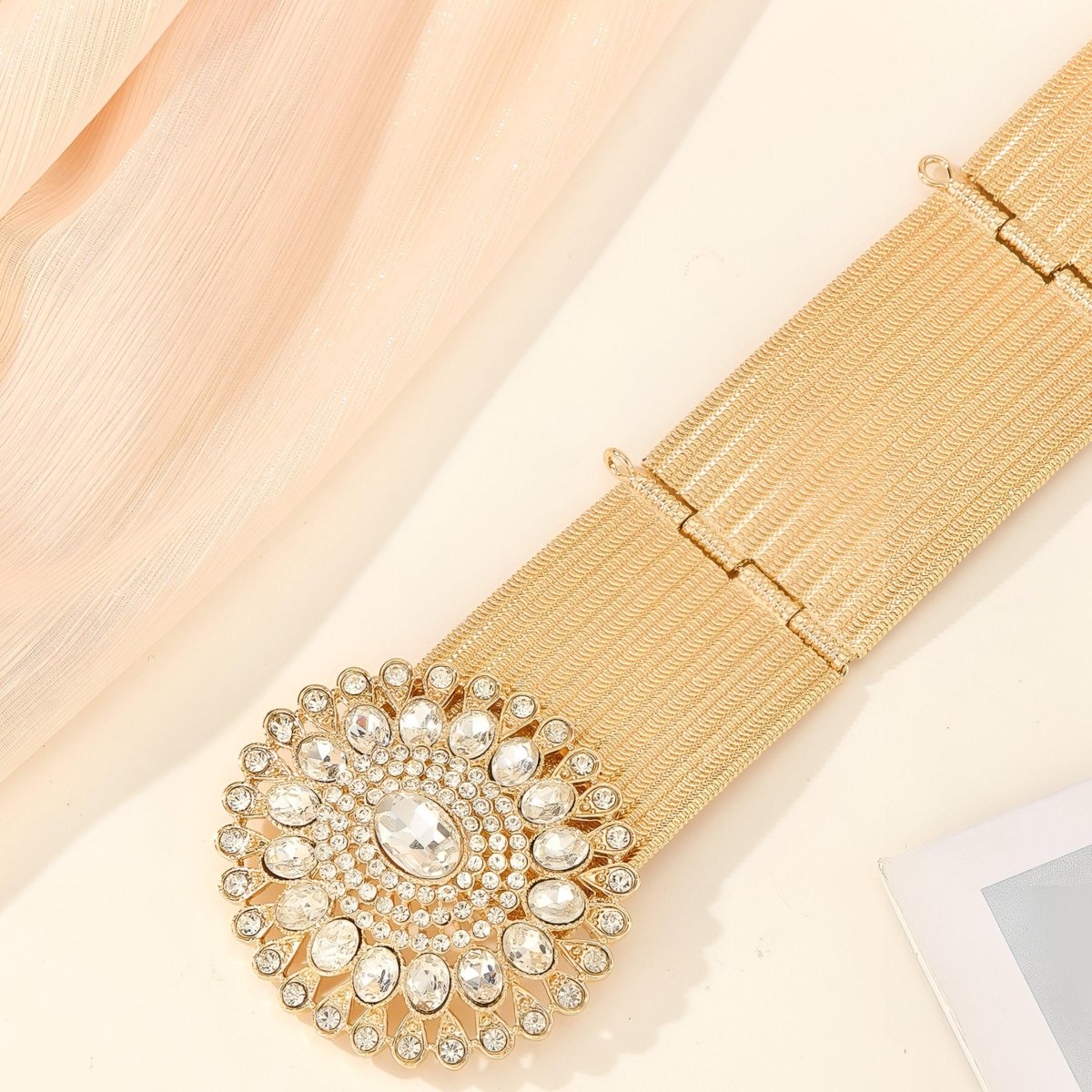 Drawing from contemporary elegance and the rich Moroccan culture, this belt stands out with its broad golden strap featuring sleek lines and a luxuriant central medallion. Adorned with multiple crystals arranged in a delicate mandala, the jewel shines like a sun, capturing daylight to radiate through the heart of evening ceremonies.