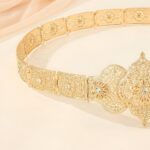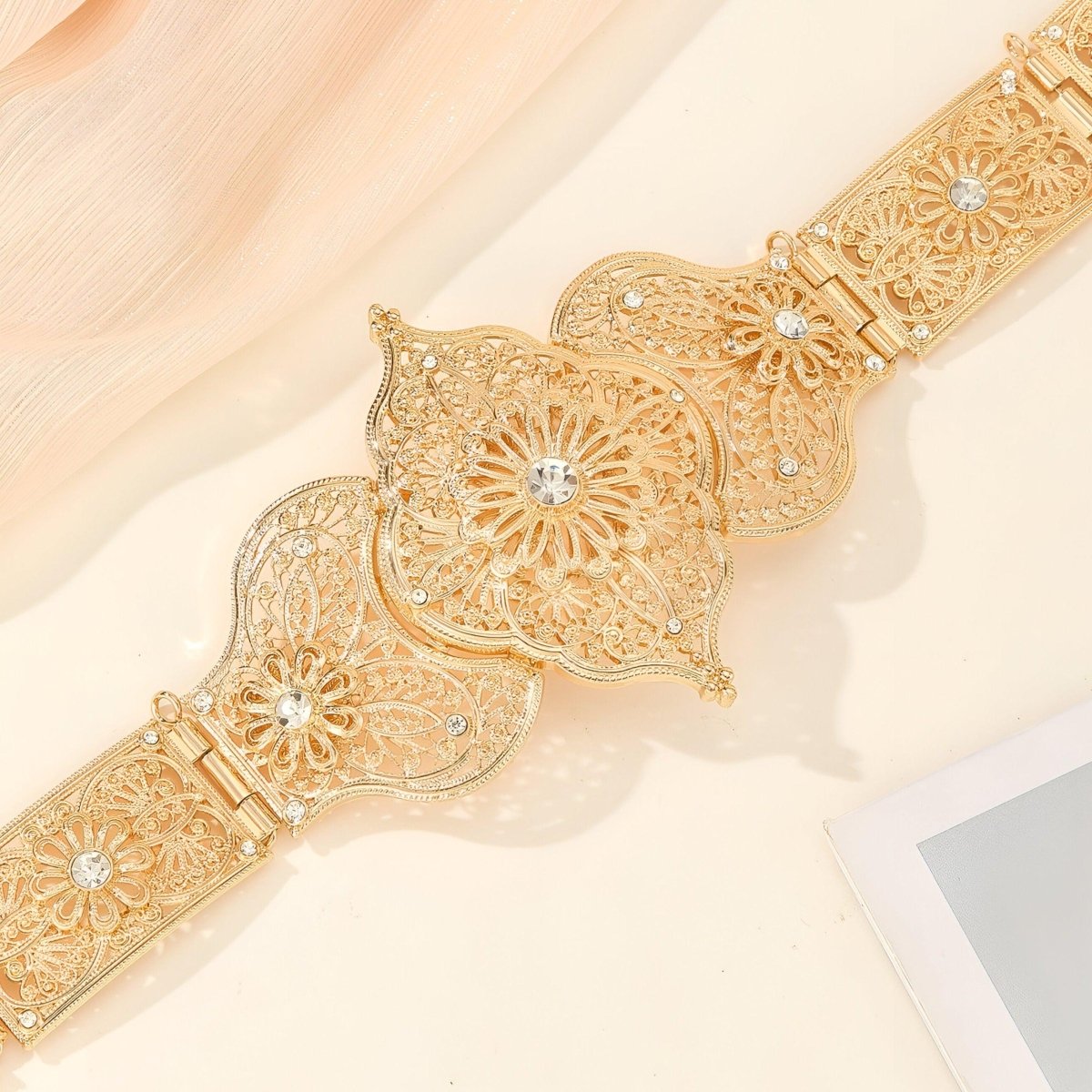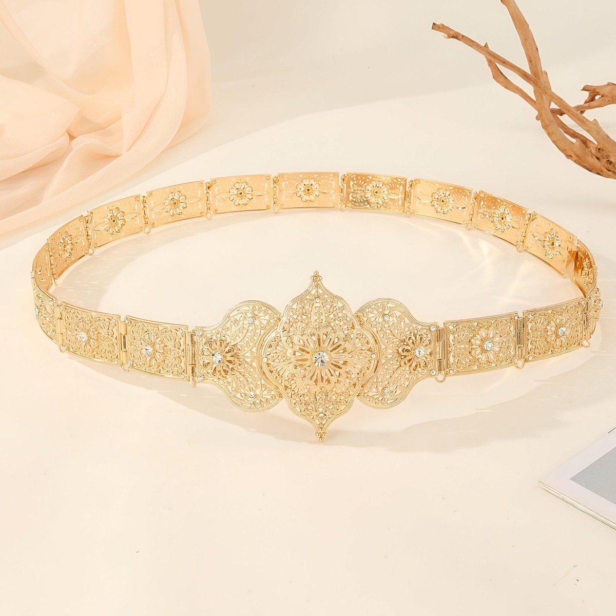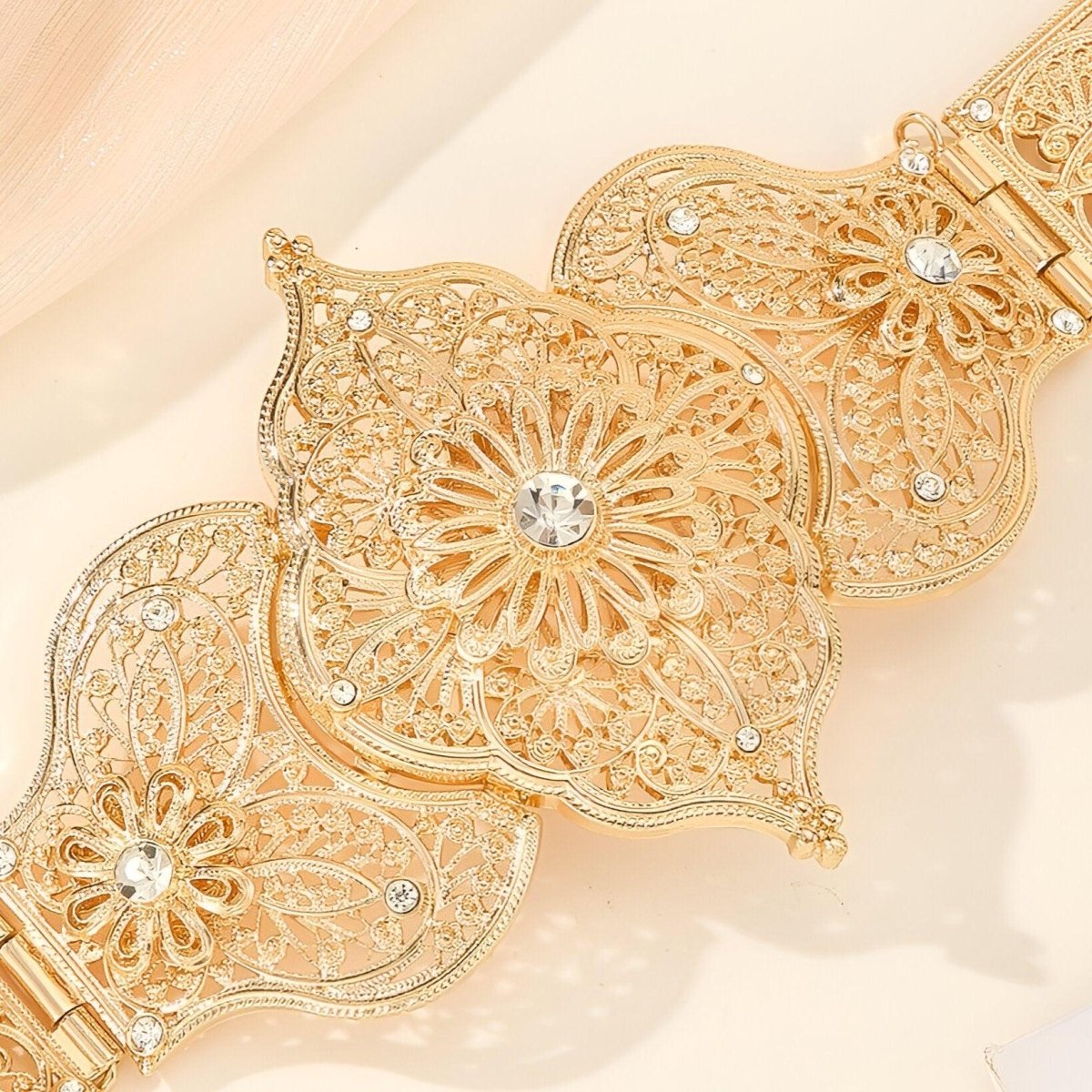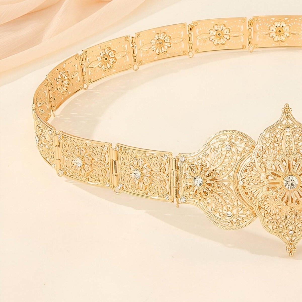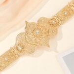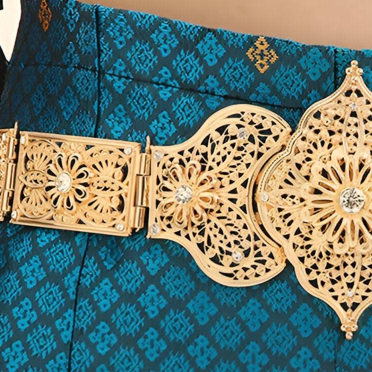 This Moroccan belt is a true gem, a crafted treasure designed to capture the splendour of Marrakech palaces. The central medallion, reminiscent of the rose window of ancient mosques, is a marvel of artistic engineering, surrounded by carved golden plates that evoke the delicate arabesques and floral patterns of the intricately carved ceilings found in Moorish architecture.
