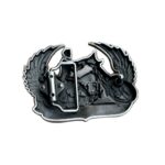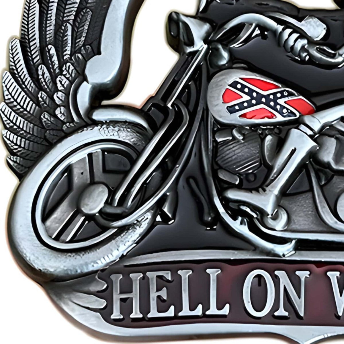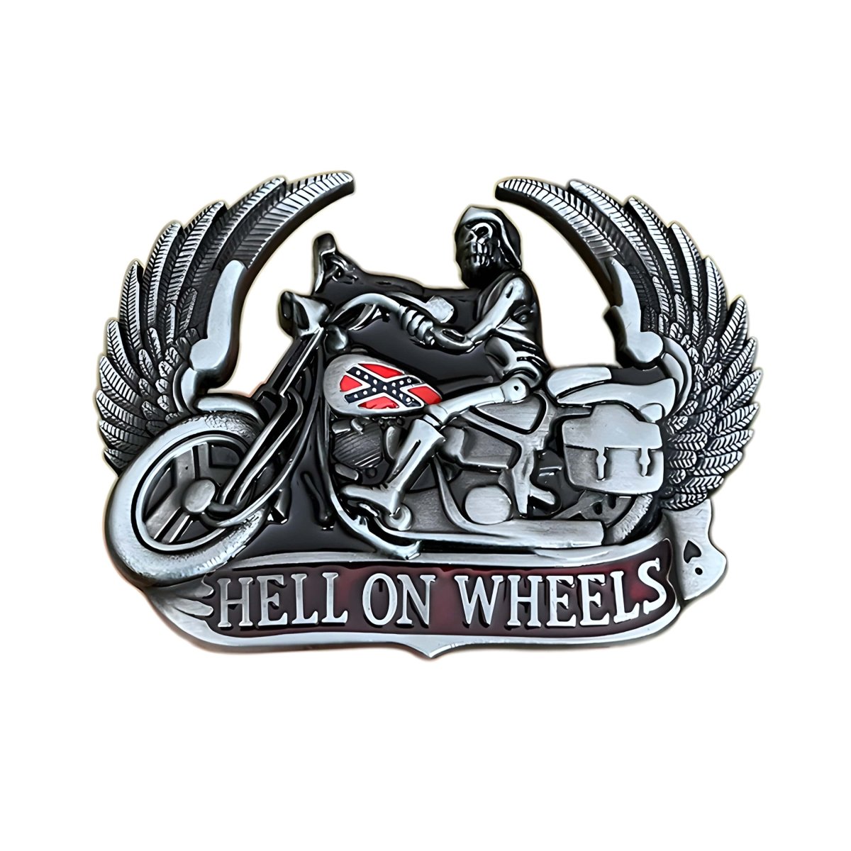 The 'Hell on Wheels' belt buckle epitomises bold escape and the unyielding spirit of biker culture. Featuring a classic motorcycle topped with a resolute skeleton at the helm, it is framed by majestic wings, symbolising the freedom to soar down the road with boundless courage. It's the perfect accessory to showcase a passion for asphalt adventures and a life without constraints.