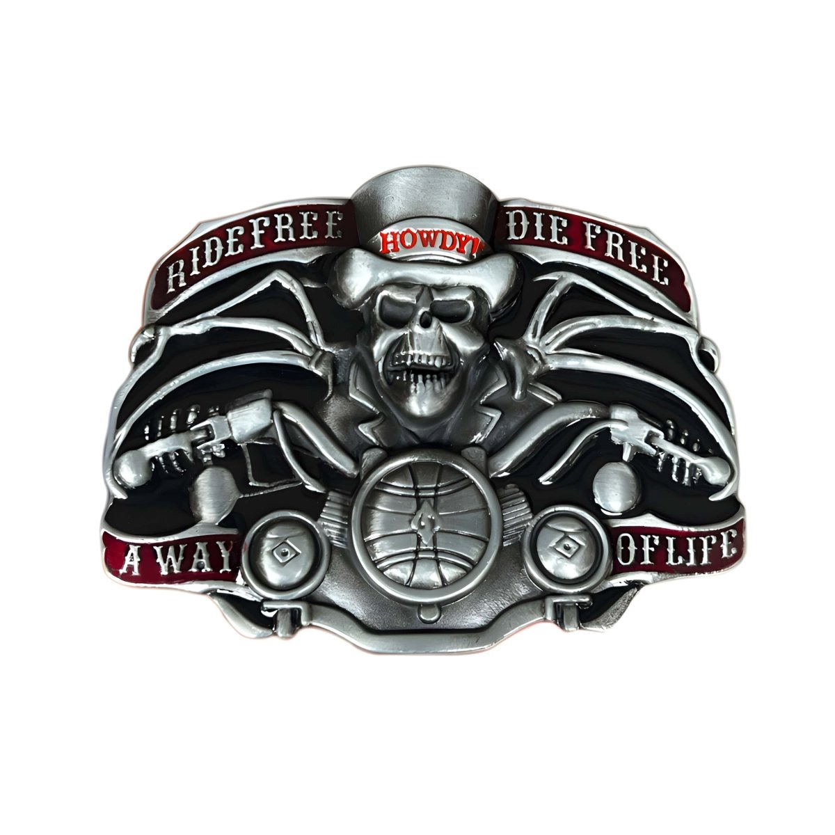 Embodying the very essence of biker culture, this meticulously crafted piece resonates with a life of deliberate choices and open roads. The fusion of gleaming metal and dark varnish, highlighted by the words 'RIDE FREE' and 'DIE FREE', not only creates a belt buckle but a true banner for those who champion a life unchained from the mundane, where every road is a new chance to showcase bravery and a love of freedom.