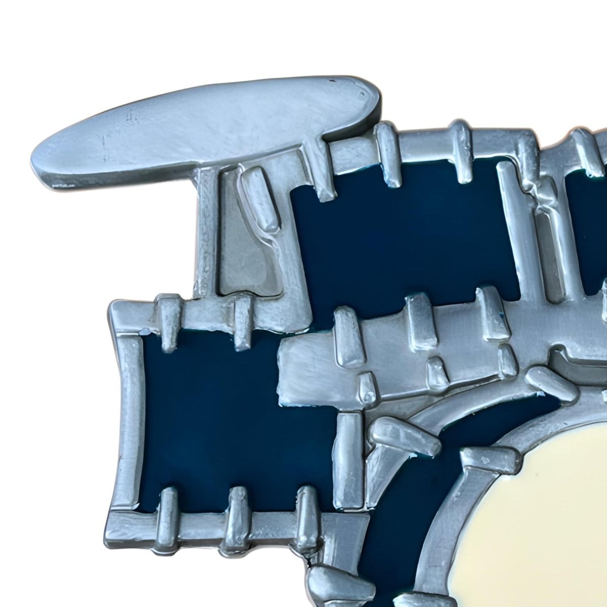 Embodying the very essence of rock'n'roll, this drum-shaped belt buckle is a true rallying cry for drummers and music lovers whose hearts beat in rhythm. Featuring a distinctive silhouette that mirrors a full drum kit, this accessory is a tribute to the tempo of life, a unique item that adds a touch of raw creativity and an untamed spirit to your wardrobe.