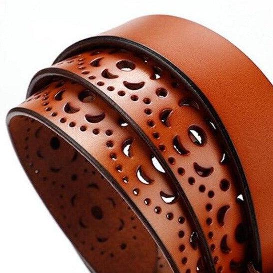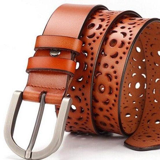 The Eteri belt is a true celebration of sophistication. Expertly crafted, its genuine leather strap is enhanced with delicate floral perforations, turning every inch of this masterpiece into a tribute to beauty. Unmatched in elegance, this belt combines the durability of cowhide leather with the grace of a floral design. Available in a variety of shades - cognac, white, black, and red - it ensures a harmonious match with any outfit, whether it be jeans, formal trousers, or casual wear.
