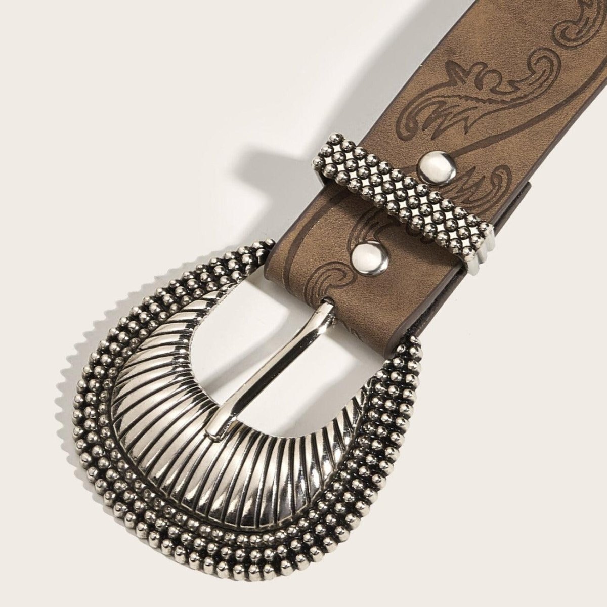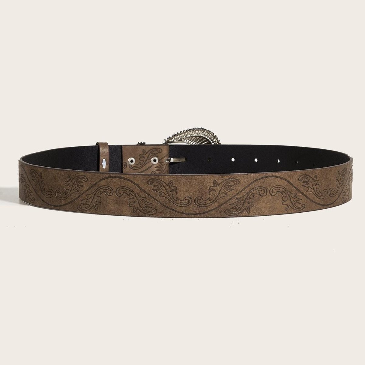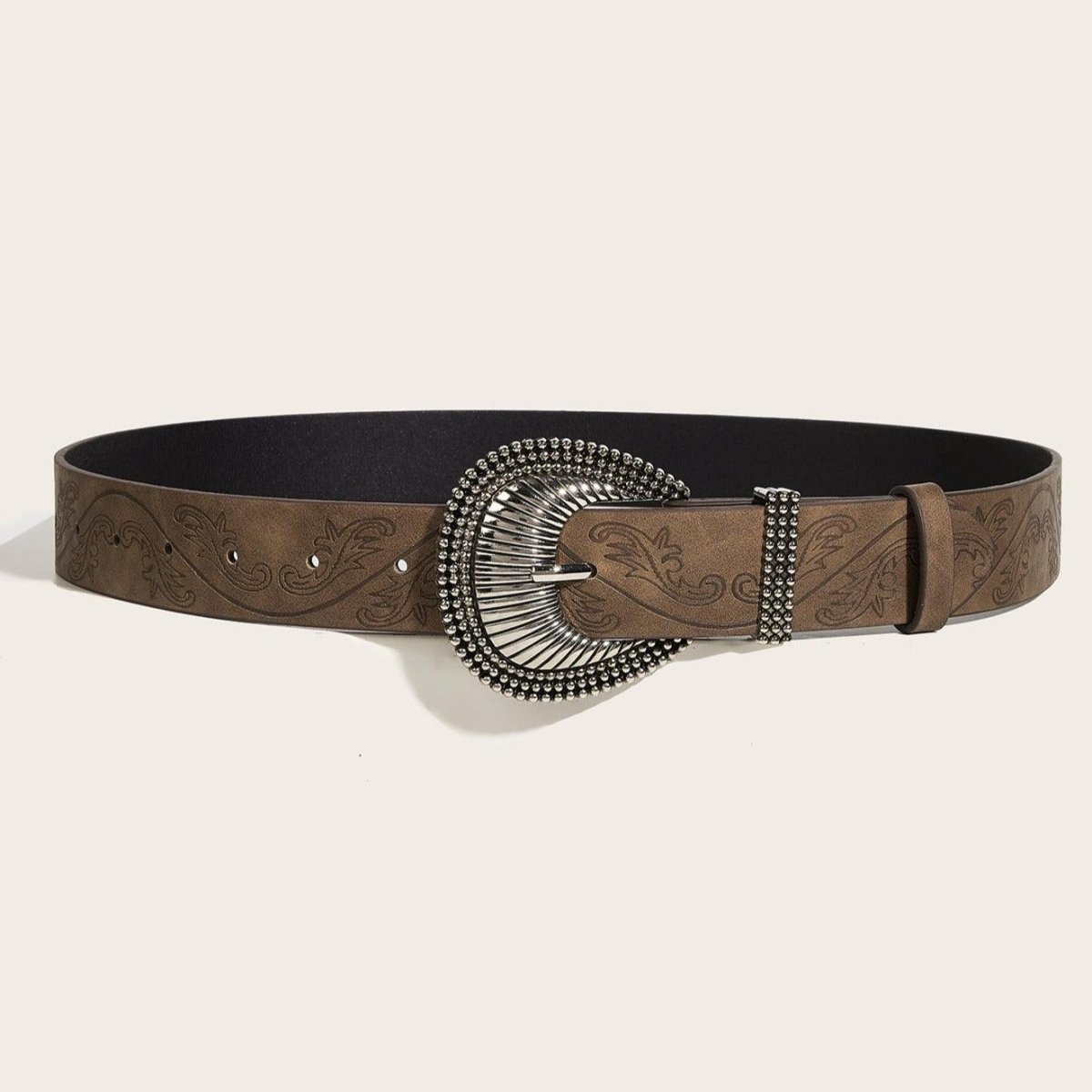 Immerse yourself in the enchanting charm of Western style with the Manoi belt. Its brown vegan faux leather strap, intricately textured with plant patterns, adds a unique flair to your ensemble. Paired with a decorative buckle, this belt delivers a fashionable and authentic look, accentuating your elegant and modern personality. Step into trend with this chic and timeless accessory that is sure to capture all the attention.