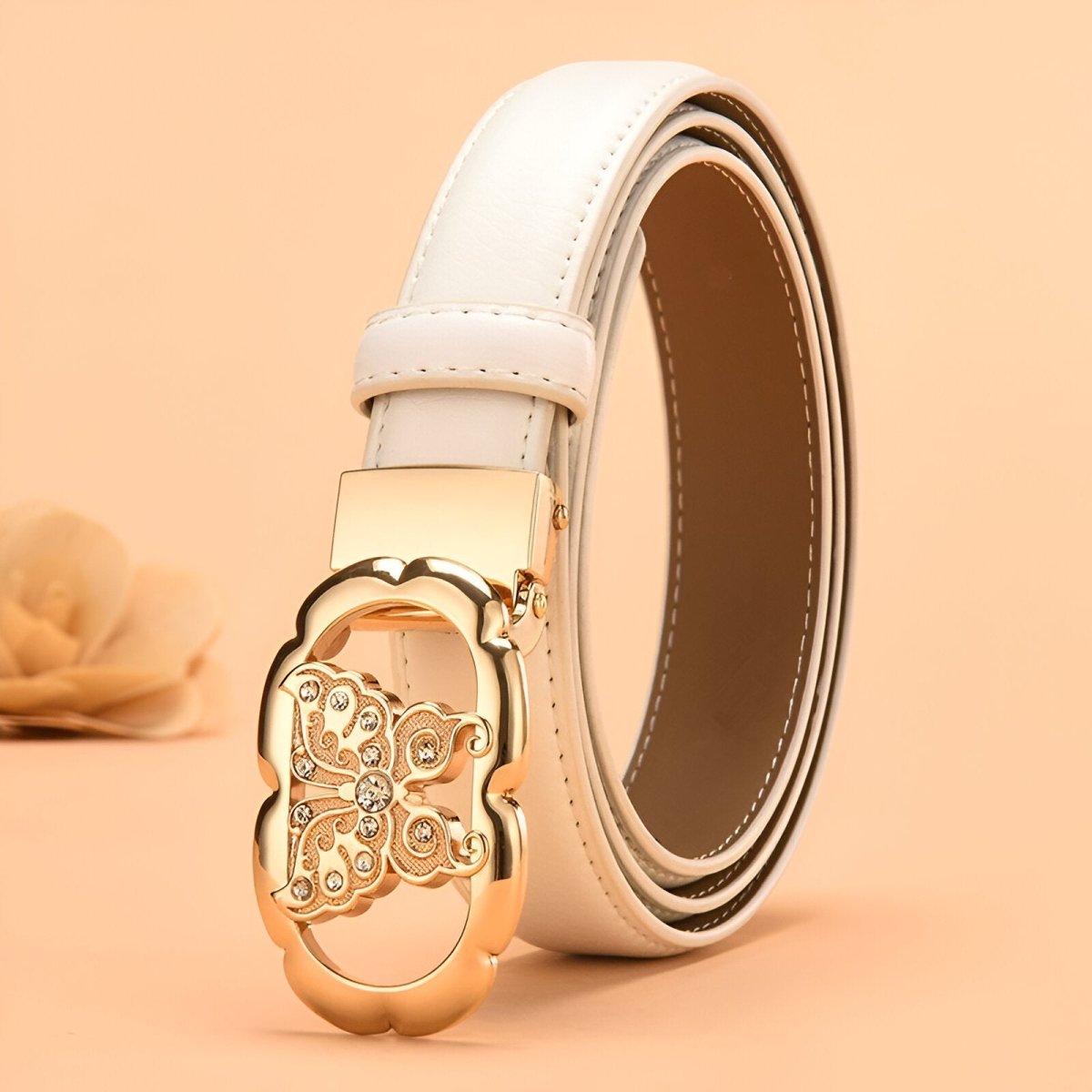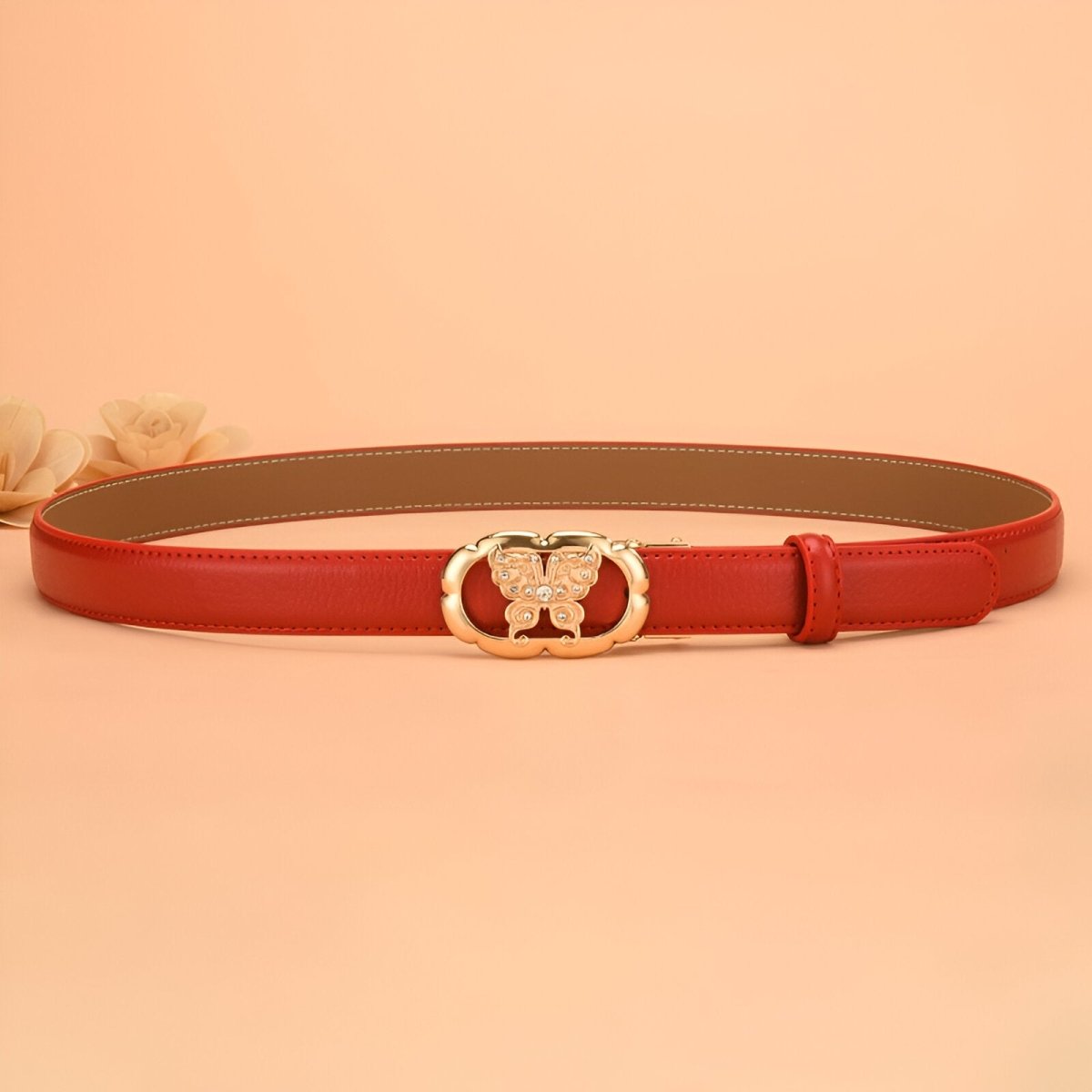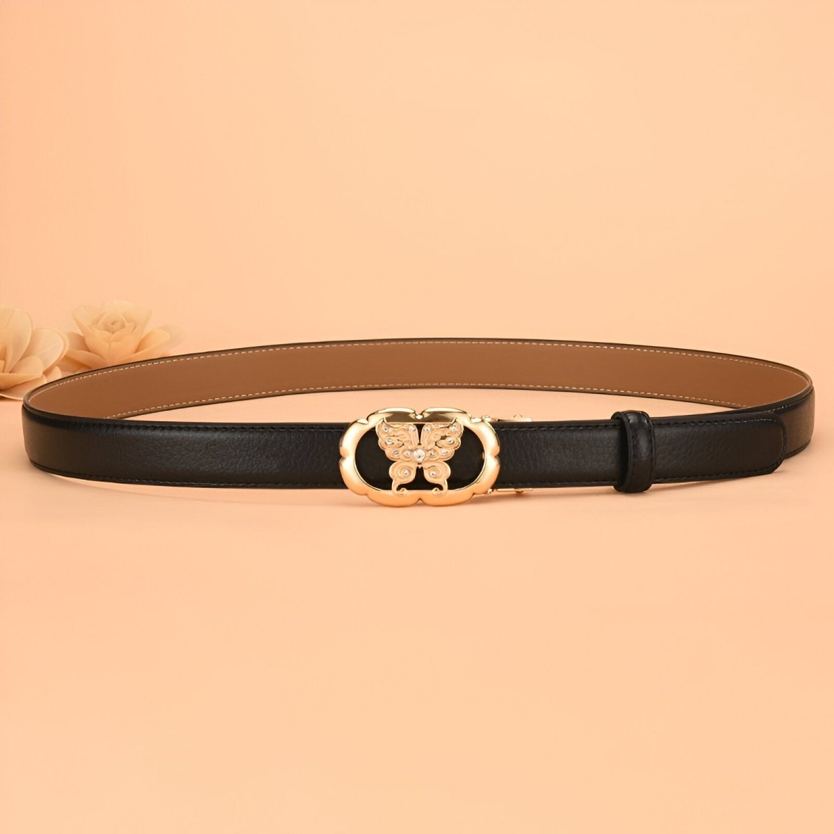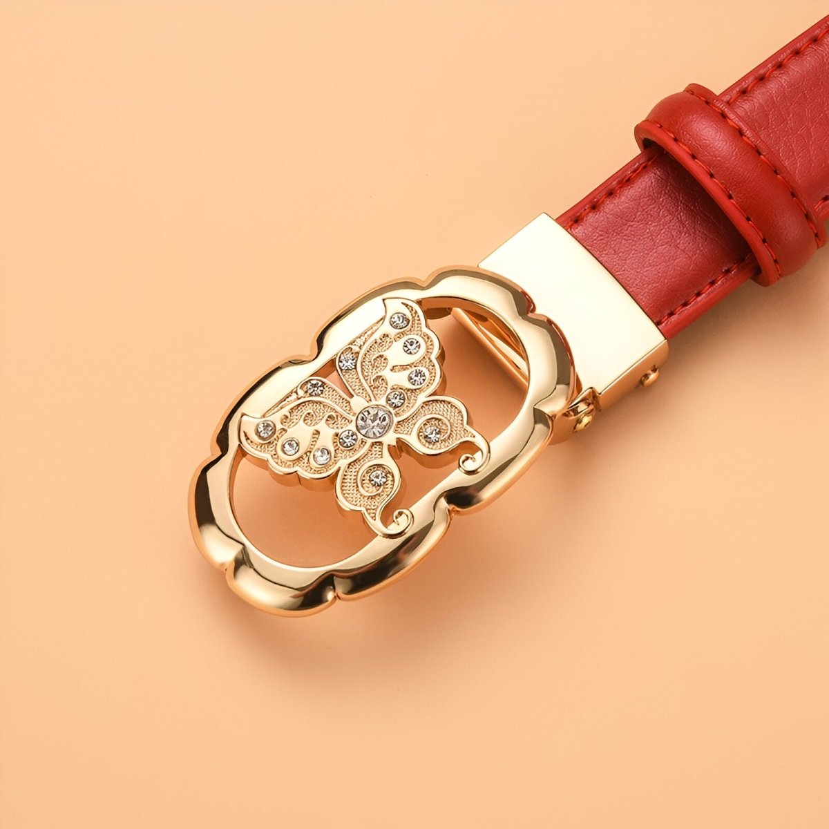 Lightweight and stylish, the butterfly has long been a symbol of transformation and delicate beauty. This leather ratchet belt captures this imagery with an artistic buckle shaped like a butterfly, adorned with intricate patterns and sparkling rhinestones. Beyond its captivating looks, the automatic closure system ensures perfect adaptability and ease of use, reflecting a thoughtfully designed accessory for modern living.