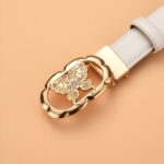 The butterfly-shaped buckle is more than just an adornment; it stands as the centerpiece of an accessory that speaks to those who cherish pieces with a story to tell. Every detail of this buckle, from the delicately embedded rhinestones to the engraved patterns, celebrates craftsmanship and sophisticated style. This ratchet belt invites you to add a touch of whimsy and refinement to a classic outfit or to enhance an ensemble with a note of timeless grace.