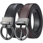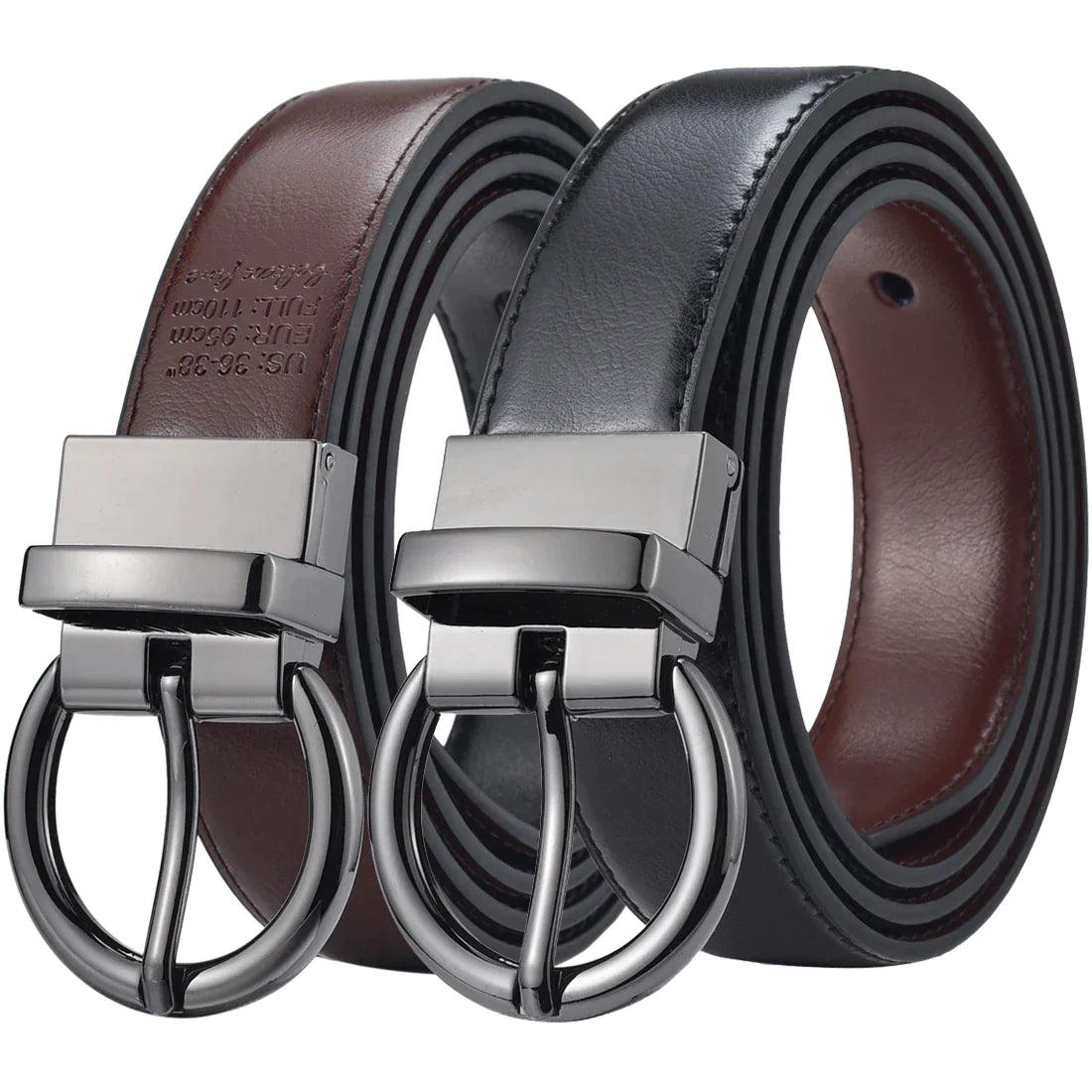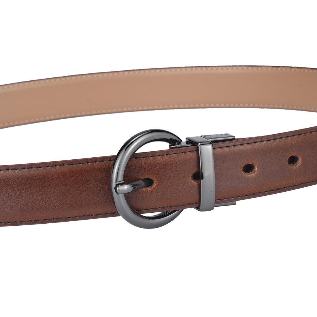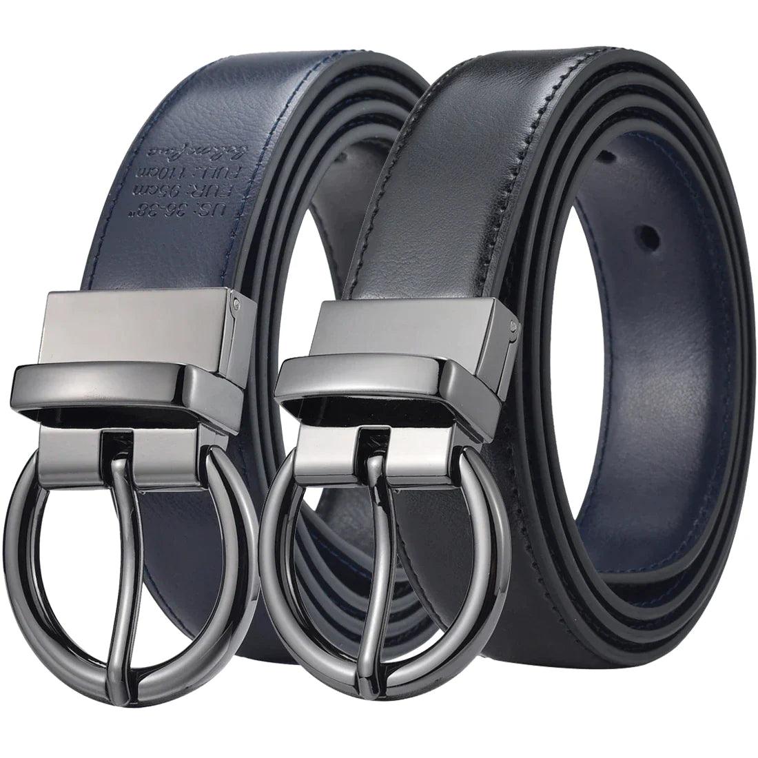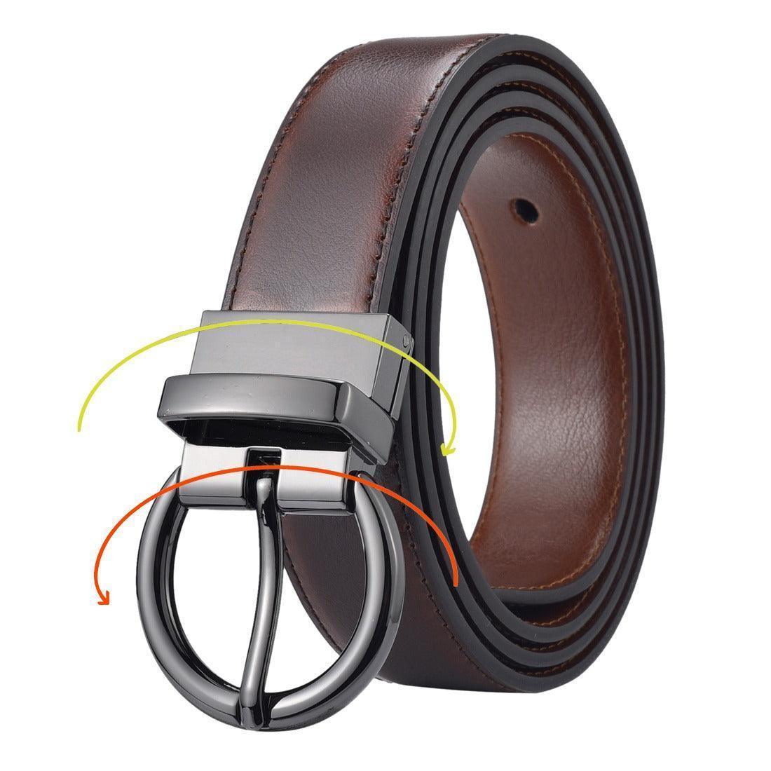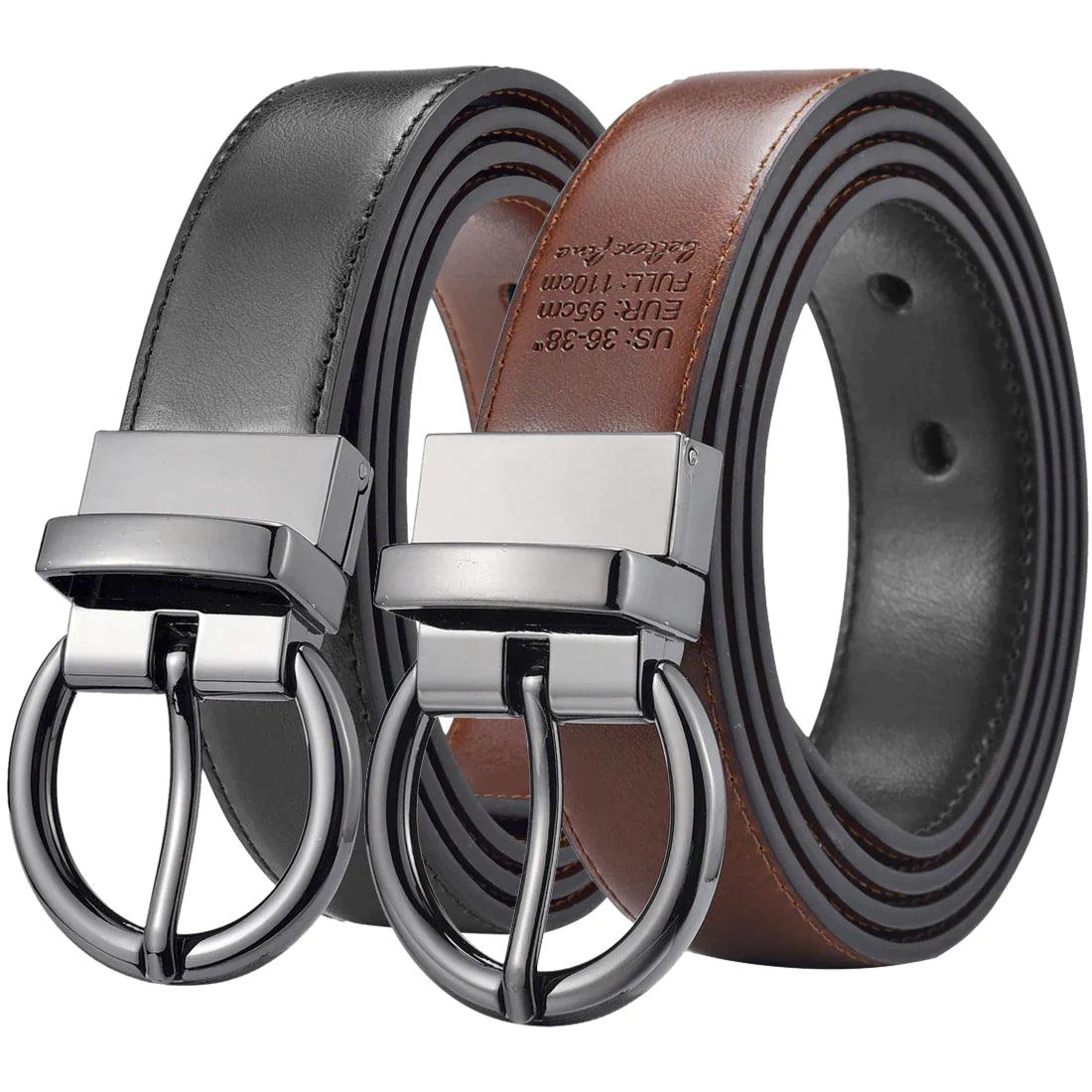 The fusion of functionality and elegance is epitomized in this 2-in-1 reversible belt. Designed to complement your evolving style, each side presents a fresh opportunity to enhance your outfit. The sophisticated rotating buckle mechanism showcases an ingenious design, allowing for a seamless switch between shades. It's the accessory that effortlessly accompanies every moment of your daily life.