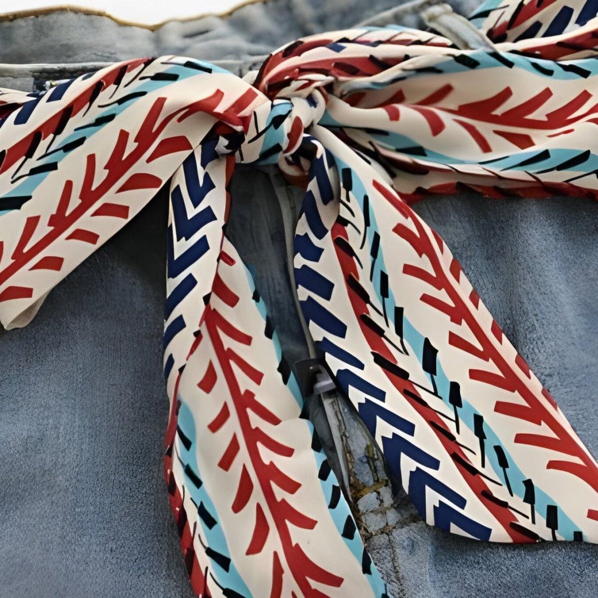 This scarf belt draws inspiration from the bohemian spirit, capturing the essence of folk art with its intricate leaf and chevron patterns. Earthy hues mingle with deep blue accents, evoking a natural palette enhanced by contemporary vibrancy. It is crafted for those who celebrate fashion as a form of living, expressive art.