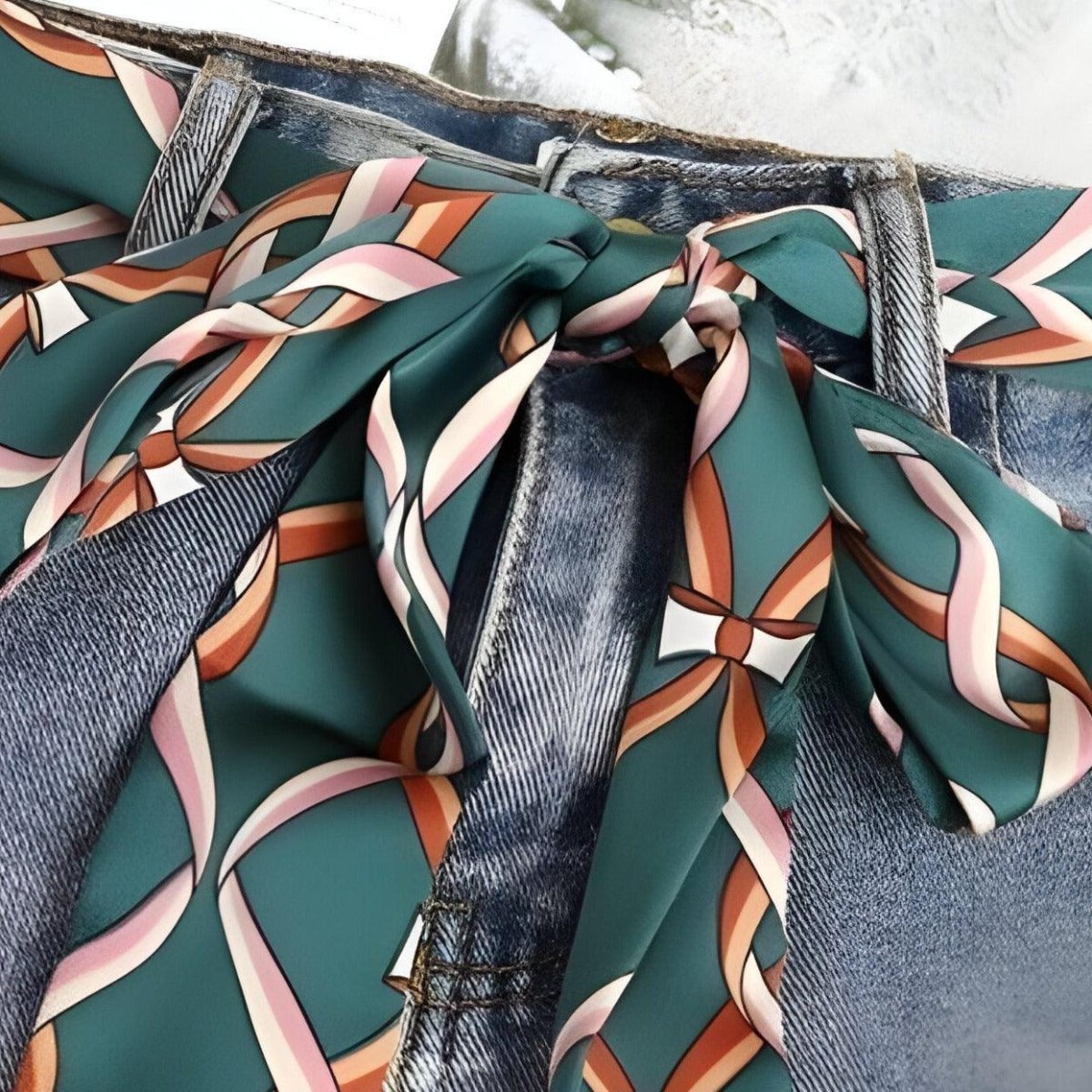Evoking the grace of ribbons dancing in the breeze, this scarf belt is a celebration of elegance in motion. Its intertwined ribbon pattern, a symphony of colour and shape, adds a dynamic visual to any outfit. With a fluidity that flatters the figure, it captivates the eye and adds an artistic dimension, reminiscent of the masterpieces found in the world's most prestigious galleries.