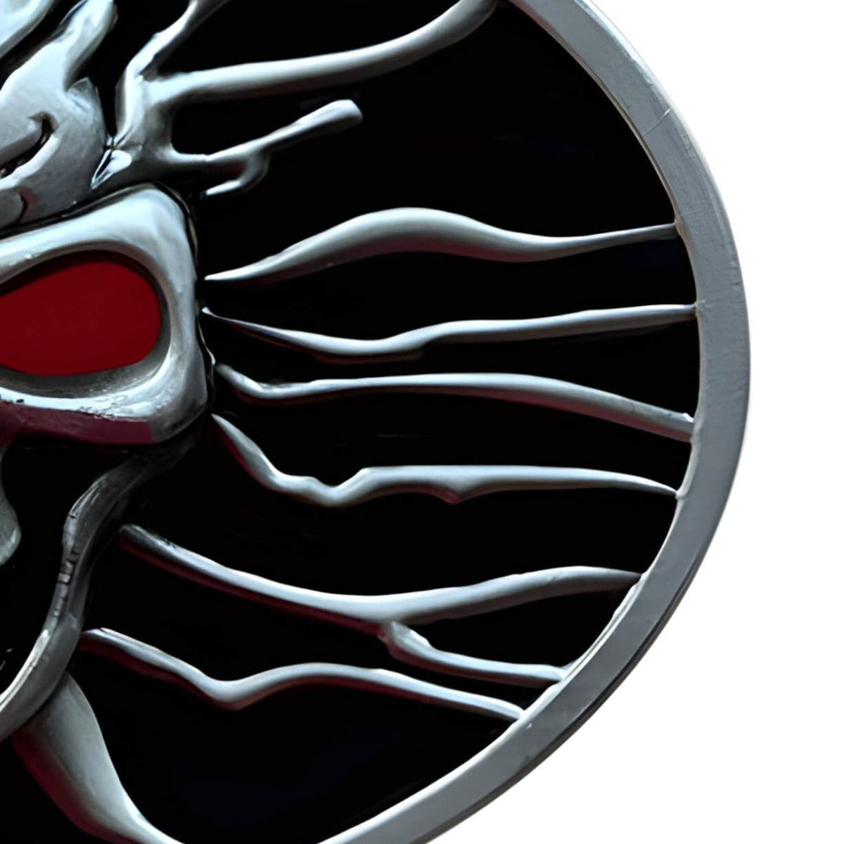 Designed for those who embrace the night as their realm, this buckle is a bold statement of spirit. The striking contrasts of black and silver, highlighted by deep red accents, make this piece a symbol of bravery and rebellion. It embodies the essence of those who dare to live by their own rules, asserting their identity with strength and originality.