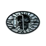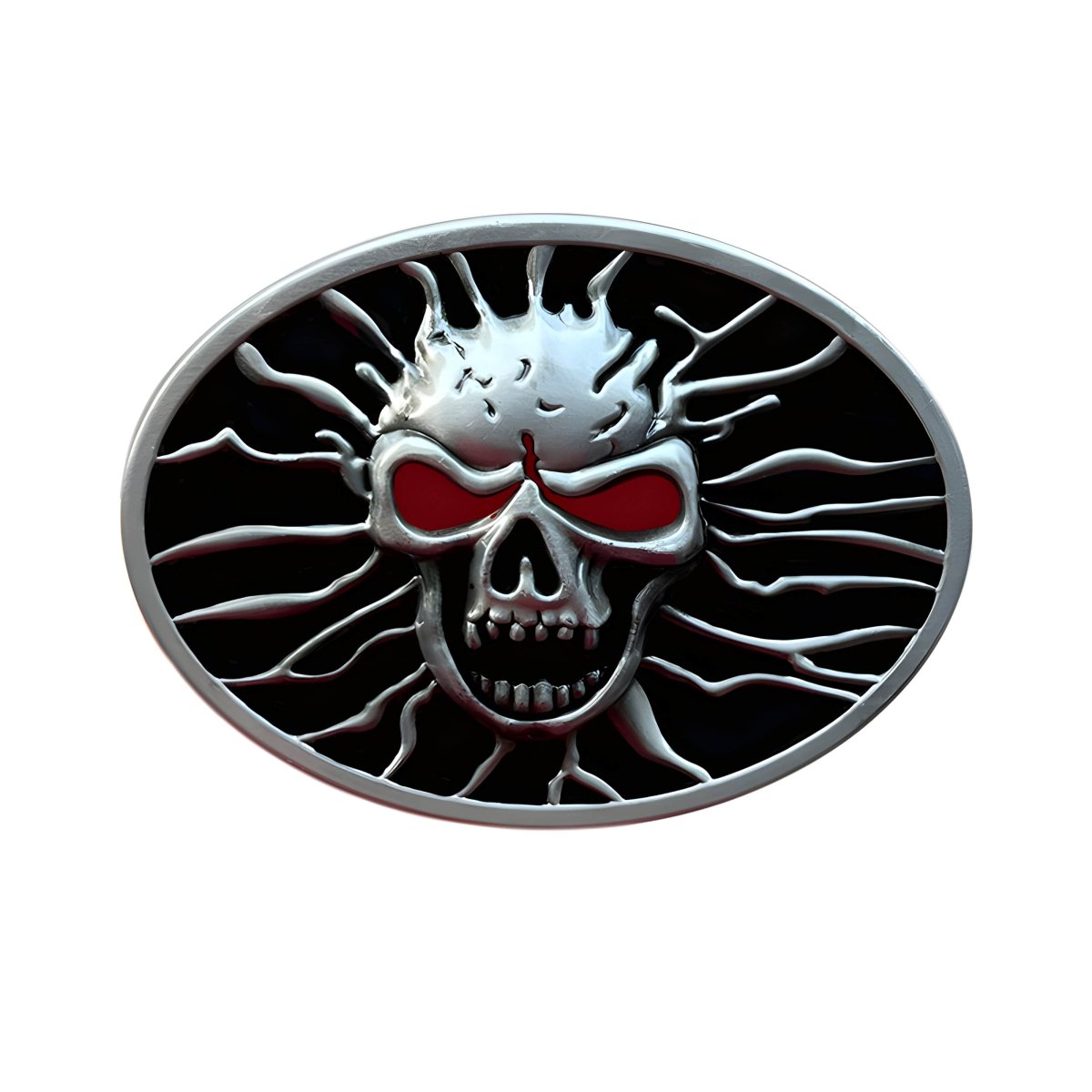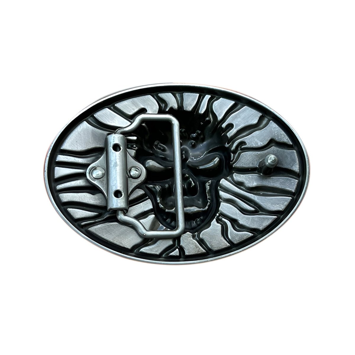Exuding a ferocious energy, this belt buckle is a true blast of darkness. At its heart, a skull with glowing red eyes emerges, surrounded by lines suggestive of flames or lightning, capturing a sense of movement and raw power. It's the perfect accessory for those looking to channel a bold and intensely vibrant presence into their style.